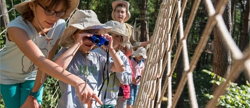 Die Kinder entdecken die Tiere des Tierzentrums, mit Ferngläsern