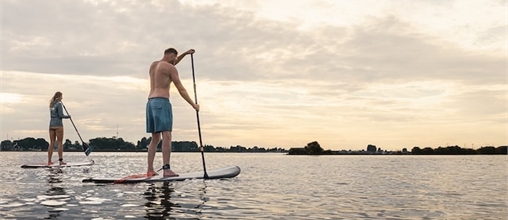 Begeben Sie sich zum Strand und versuchen Sie das Stand Up Paddling, ein Gleitsport, bei dem Sie auf einem Brett stehen und mit einem Paddel rudern.