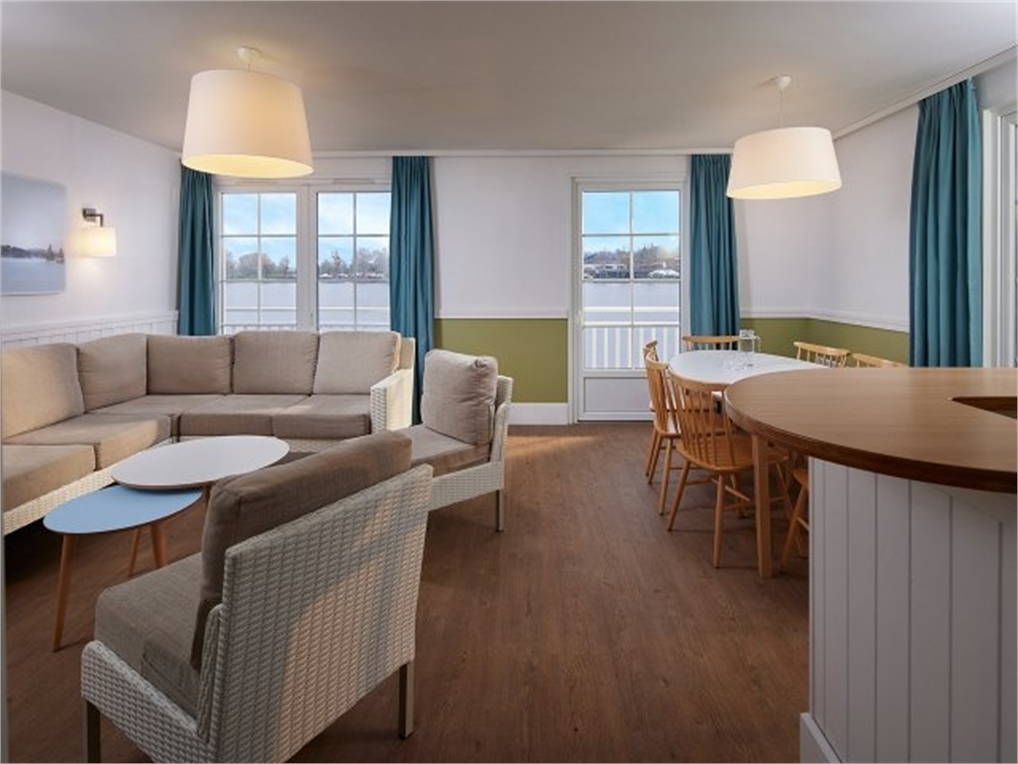 Von Ihrer überdachten Privatterrasse schweift Ihr Blick über den See. Alle Häuser des Typs Ferienhaus am See liegen direkt am Wasser. Das Panorama genießen Sie auch von innen durch die großen Fenster!