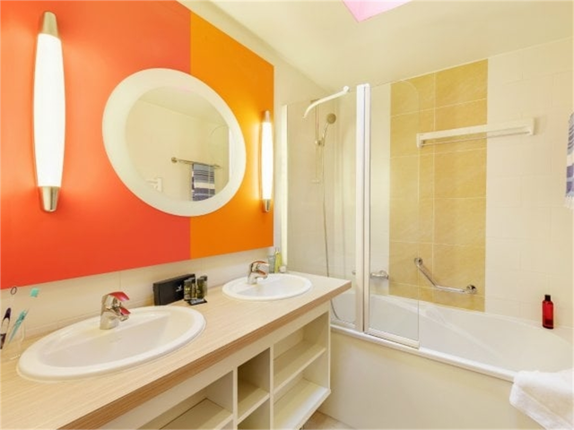 Badezimmer mit Badewanne und Doppelwaschbecken
