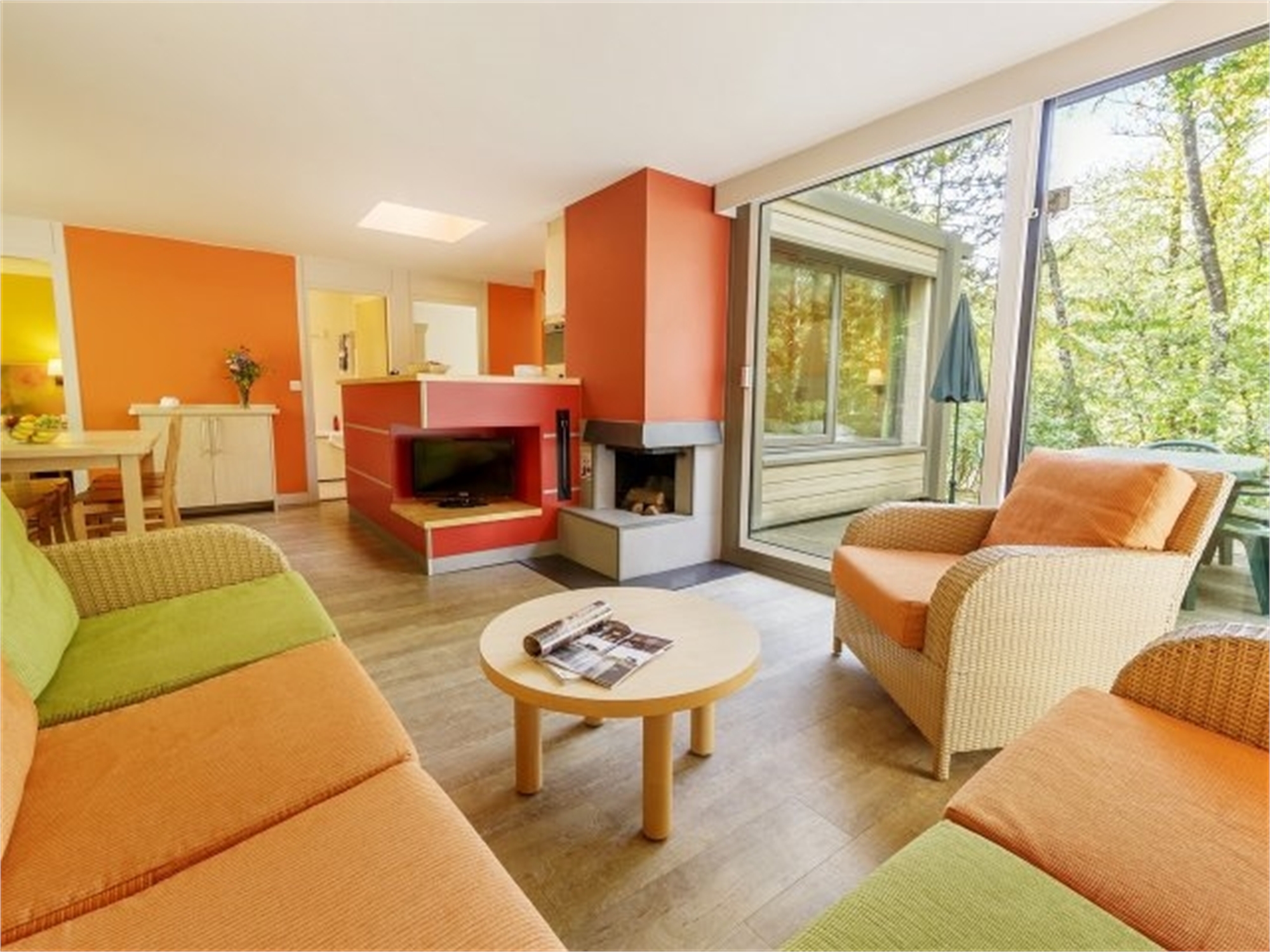 Wohnzimmer mit offenem Kamin, Flachbild-Fernseher