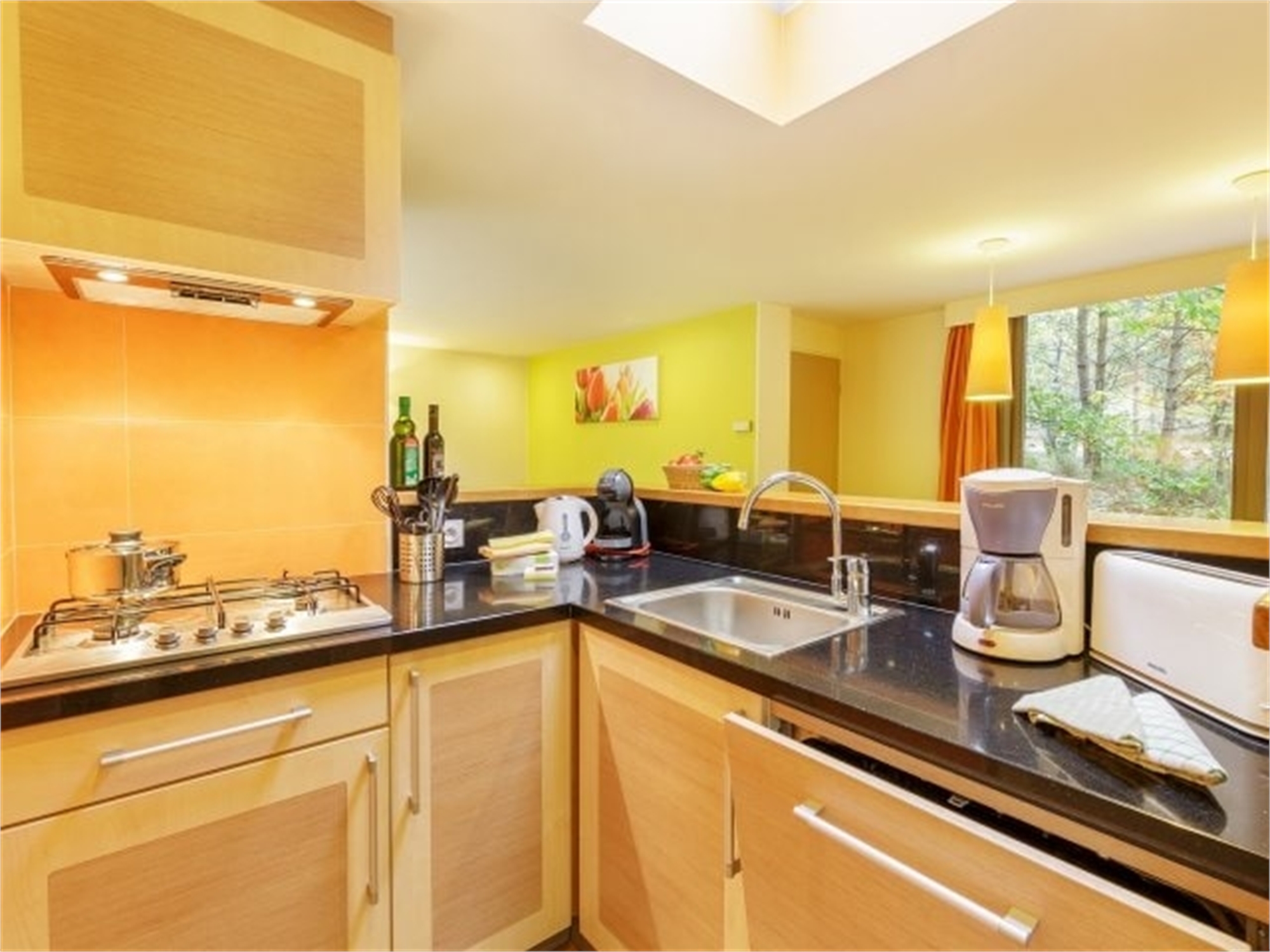 Voll ausgestattete amerikanische Küche: Spülmaschine, Kombi-Mikrowelle mit Grillfunktion, Dunstabzugshaube, Kühlschrank, Kaffeemaschine, elektrischer Wasserkocher, Toaster, Spüle, NESCAFÉ Dolce Gusto,