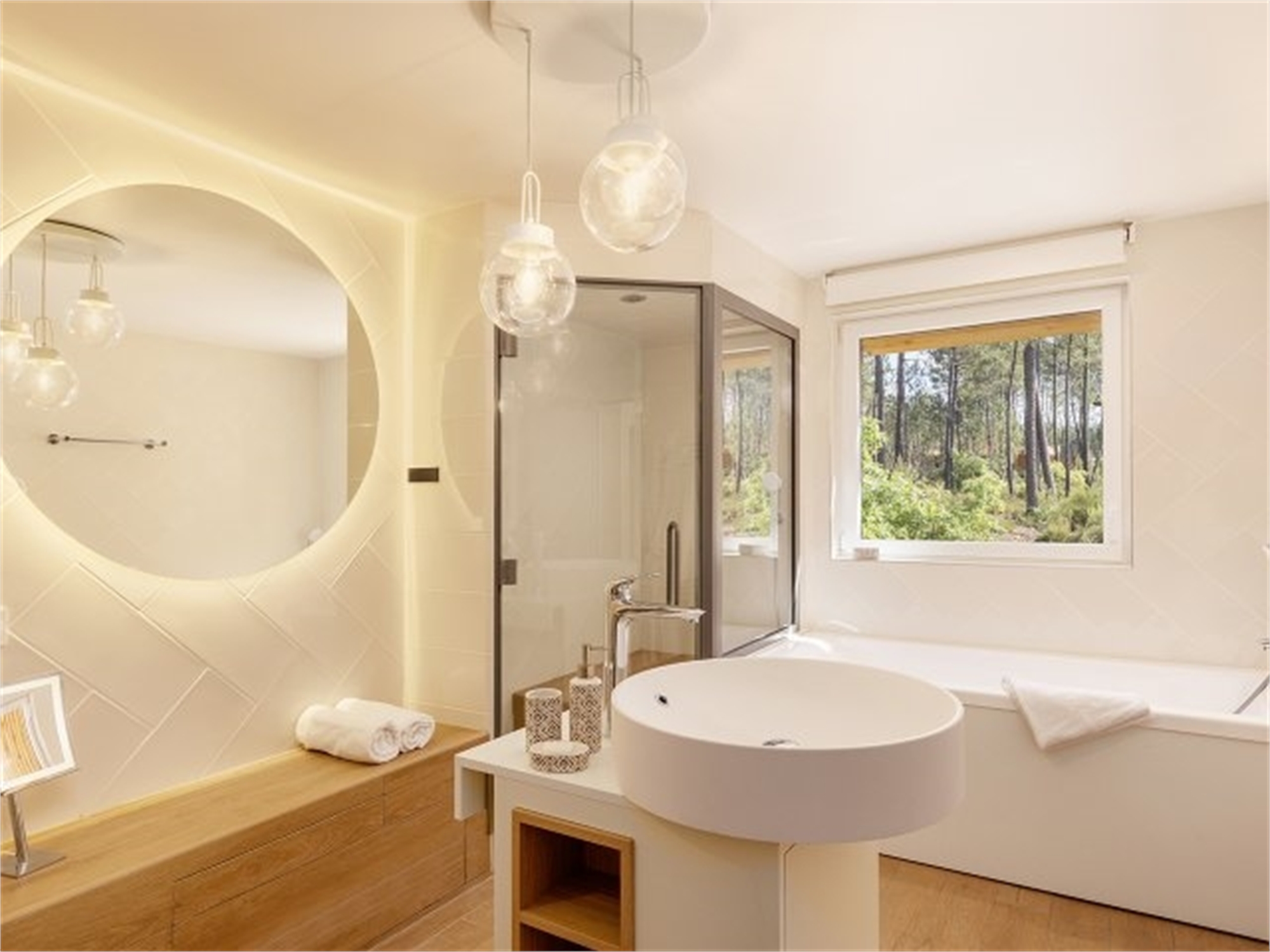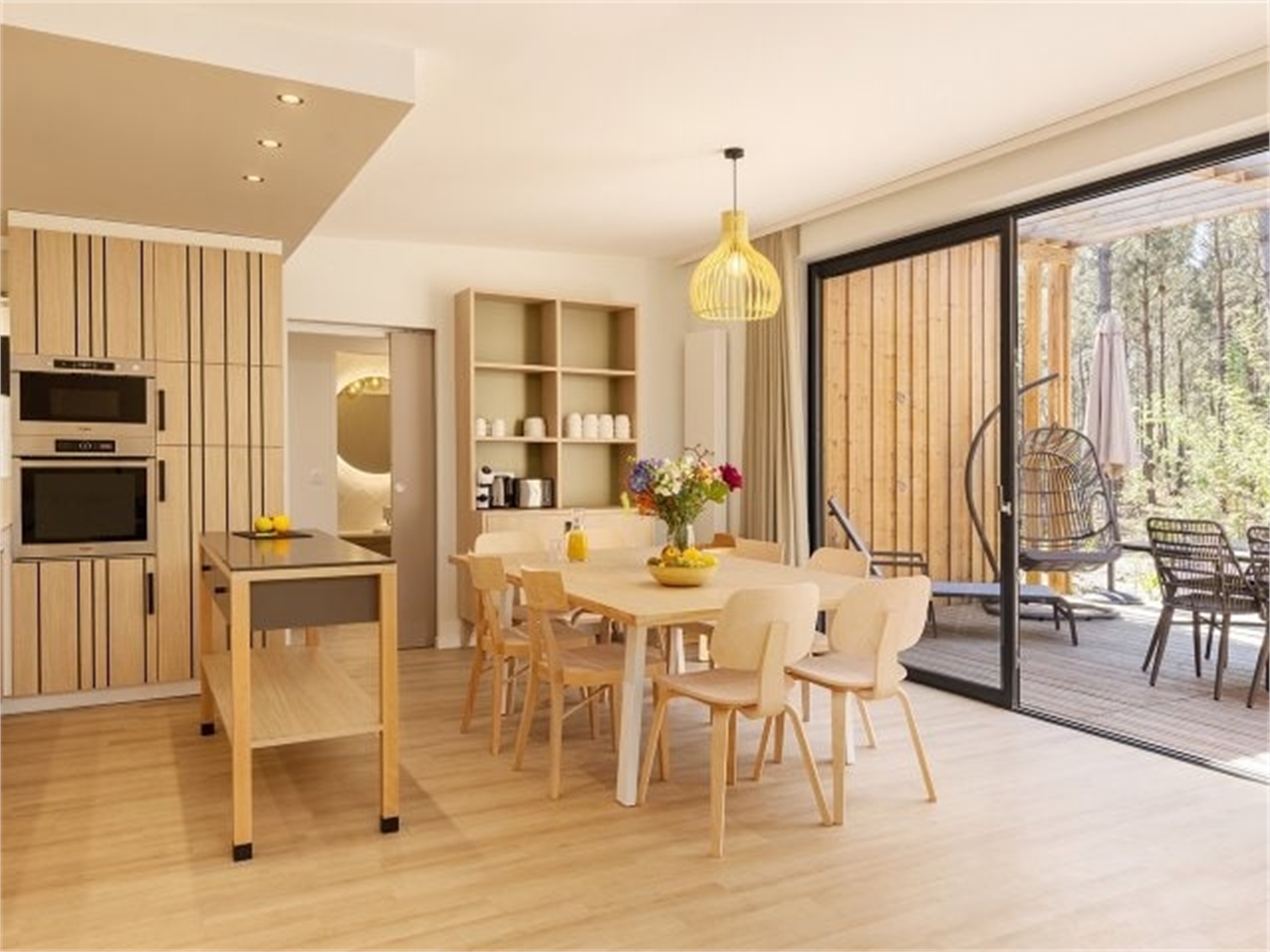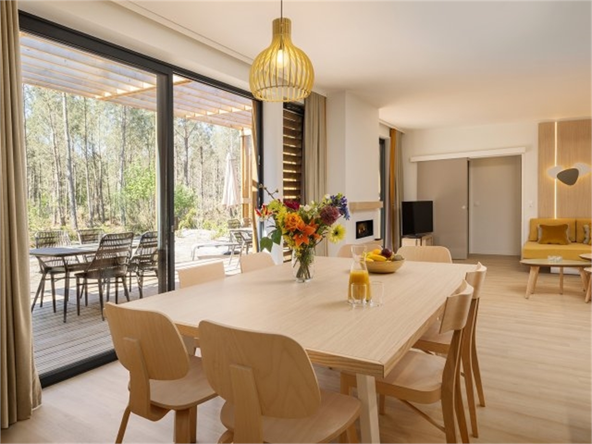 Die großzügigen Wohnräume des VIP-Ferienhauses haben große Fenster mit Blick über eine Privat-Terrasse in die freie Natur. Genießen Sie Ihr Badezimmer mit Whirlpool und Hamam sowie die exklusiven Dienstleistungen.