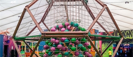 Versuchen Sie sich am ZE Cage, ein Kletterelement aus bunten Kugeln, das großen und kleinen Kletterfans viel Spaß verspricht.