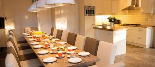 - Das Wohn- bzw. Gemeinschaftsferienhaus bietet einen großzügigen Wohn-/Essbereich für 18 Personen