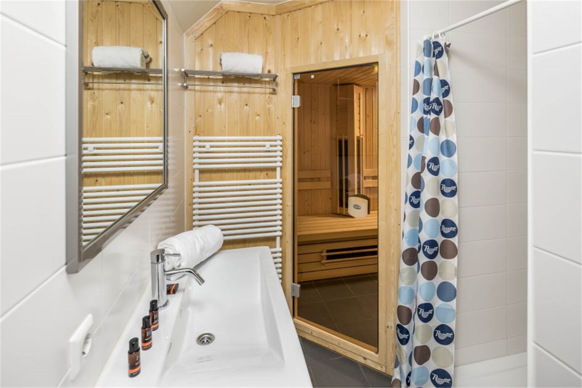 Diese luxuriöse freistehende Villa eignet sich für 10 Personen. Über den Flur erreichen Sie das helle Wohnzimmer mit Fußbodenheizung und Flügeltüren zur überdachten Terrasse. Die Villa bietet eine komplett eingerichtete Küche mit Geschirrspüler und Kühl-Gefrierkombination. Es gibt 2 separate Toiletten und einen Abstellraum für Fahrräder im Außenbereich. Im Erdgeschoss befindet sich ein Schlafzimmer mit TV-Gerät und angrenzendem Badezimmer. Im Obergeschoss befinden sich 4 weitere Schlafzimmer und 3 Badezimmer, davon eins mit Dusche, eins mit Dusche und Infrarotsauna und eins mit Badewanne.