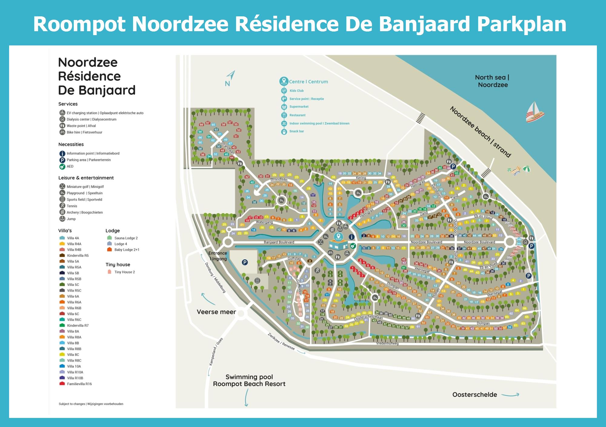 Aktueller und übersichtlicher Parkplan von Roompot Noordzee Résidence De Banjaard mit alle Unterkünfte und Einrichtungen, auch als PDF herunterladbar.