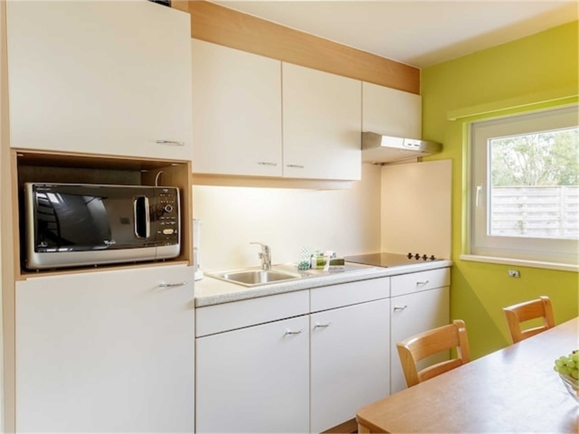 Vollständig ausgestattete KücheKühlschrankFilterkaffeemaschineToasterWasserkocherHochstuhlKochfeldMikrowelle Draußen