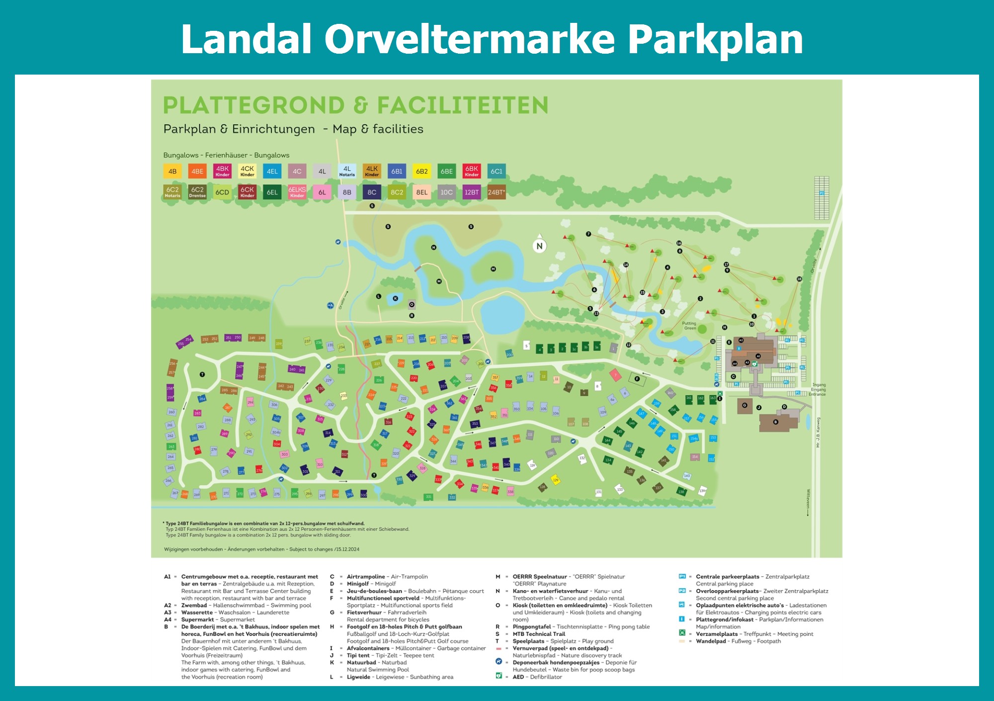 Aktueller und übersichtlicher Parkplan von Landal Orveltermarke mit alle Unterkünfte und Einrichtungen, auch als PDF herunterladbar.