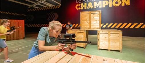 Bei der Cool Factor: Laser Battle geht es darum, das gegnerische Team zu dezimieren. Das geschieht mit Sensoren an den Lasergewehren. Ein Instrukteur achtet darauf, dass die Regeln eingehalten werden.