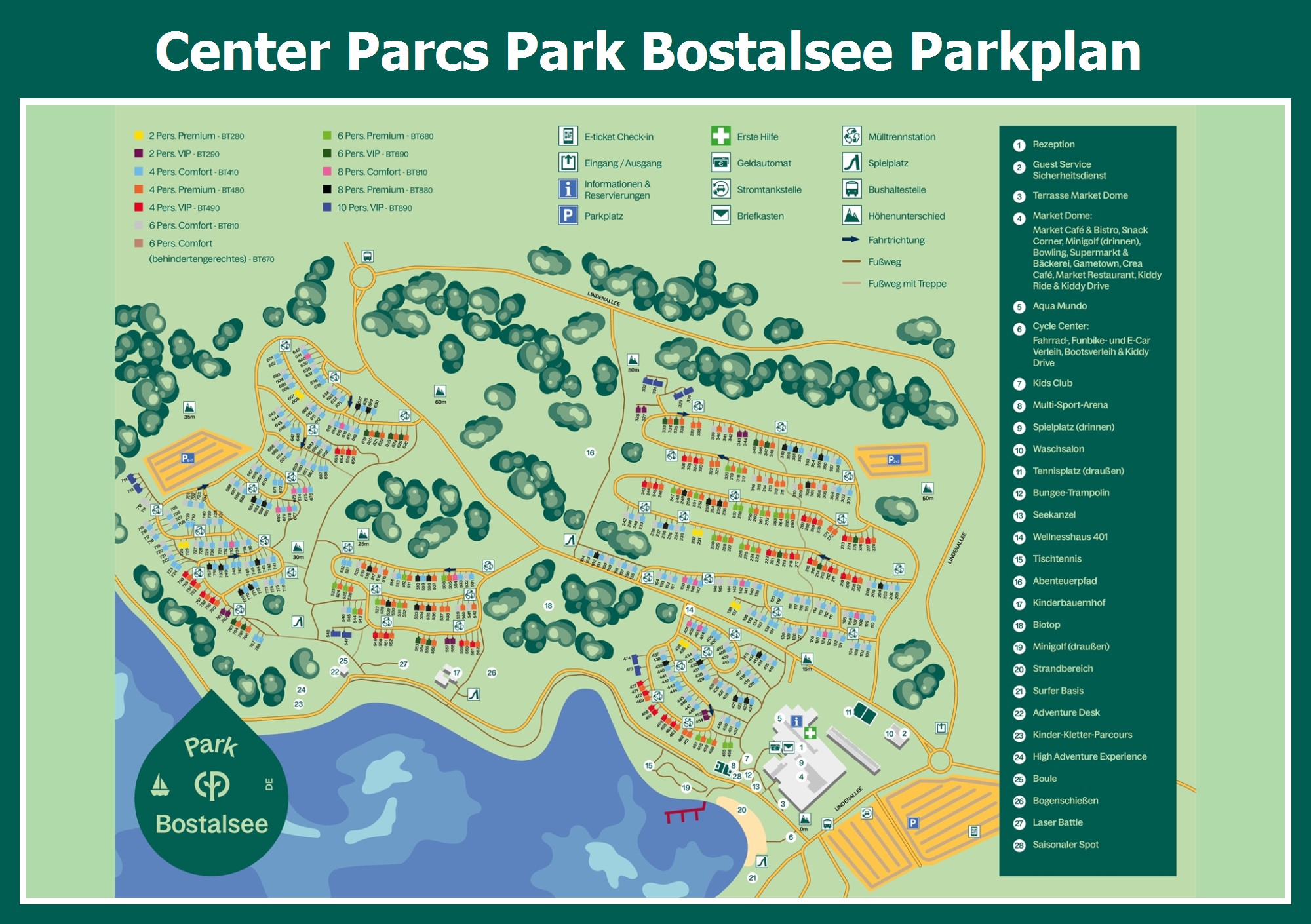 Aktueller und übersichtlicher Parkplan von Center Parcs Park Bostalsee mit alle Unterkünfte und Einrichtungen, auch als PDF herunterladbar.