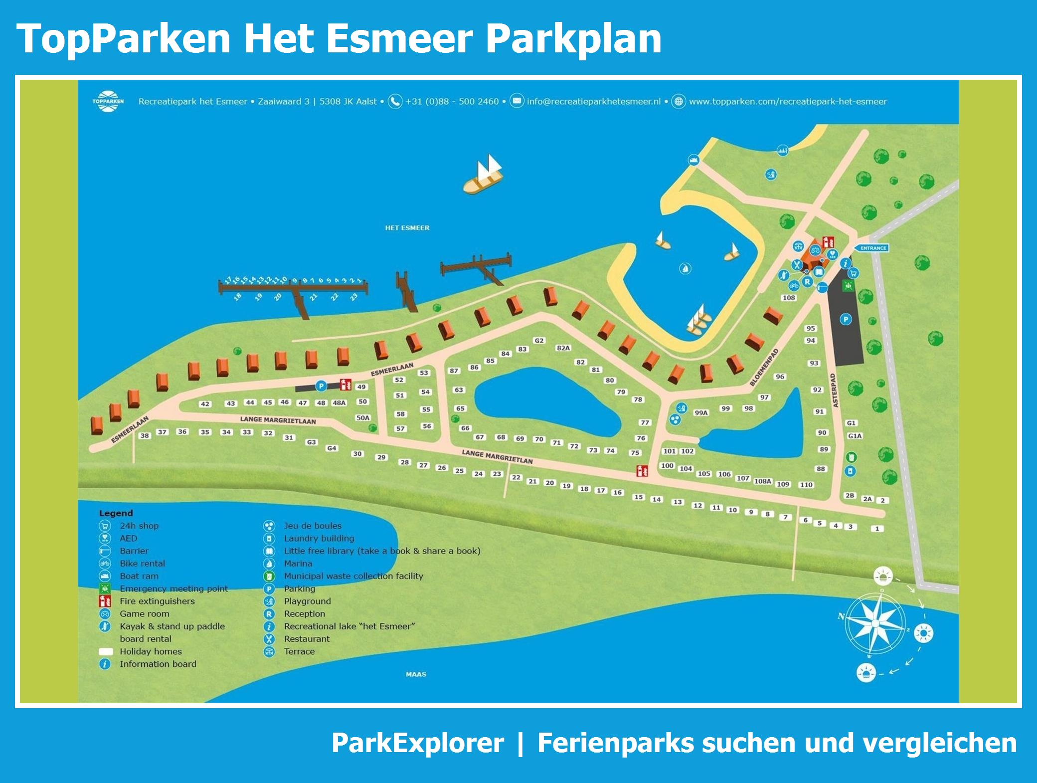 Aktueller und übersichtlicher Parkplan von TopParken Het Esmeer mit alle Unterkünfte und Einrichtungen, auch als PDF herunterladbar.