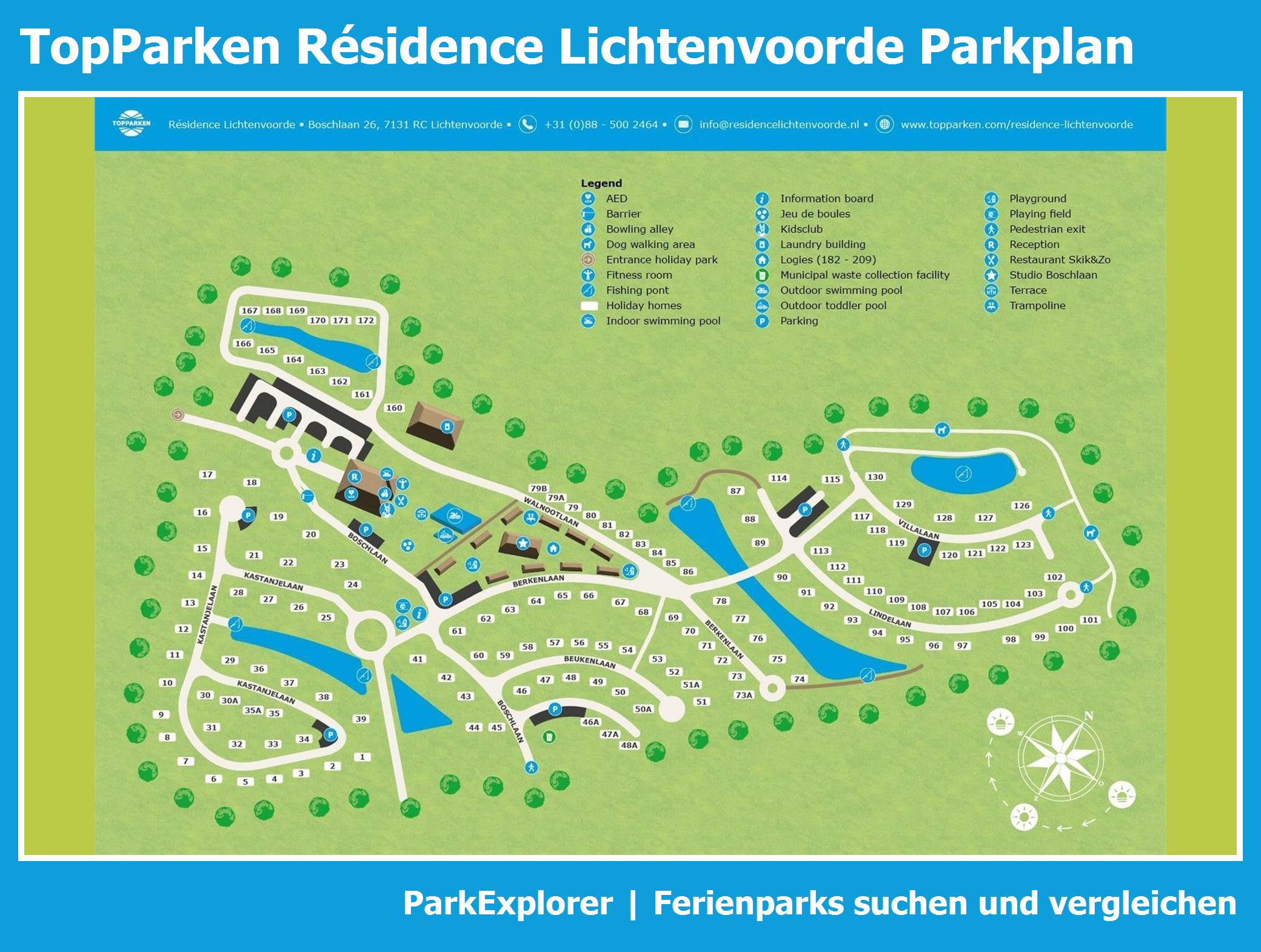 Aktueller und übersichtlicher Parkplan von TopParken Résidence Lichtenvoorde mit alle Unterkünfte und Einrichtungen, auch als PDF herunterladbar.
