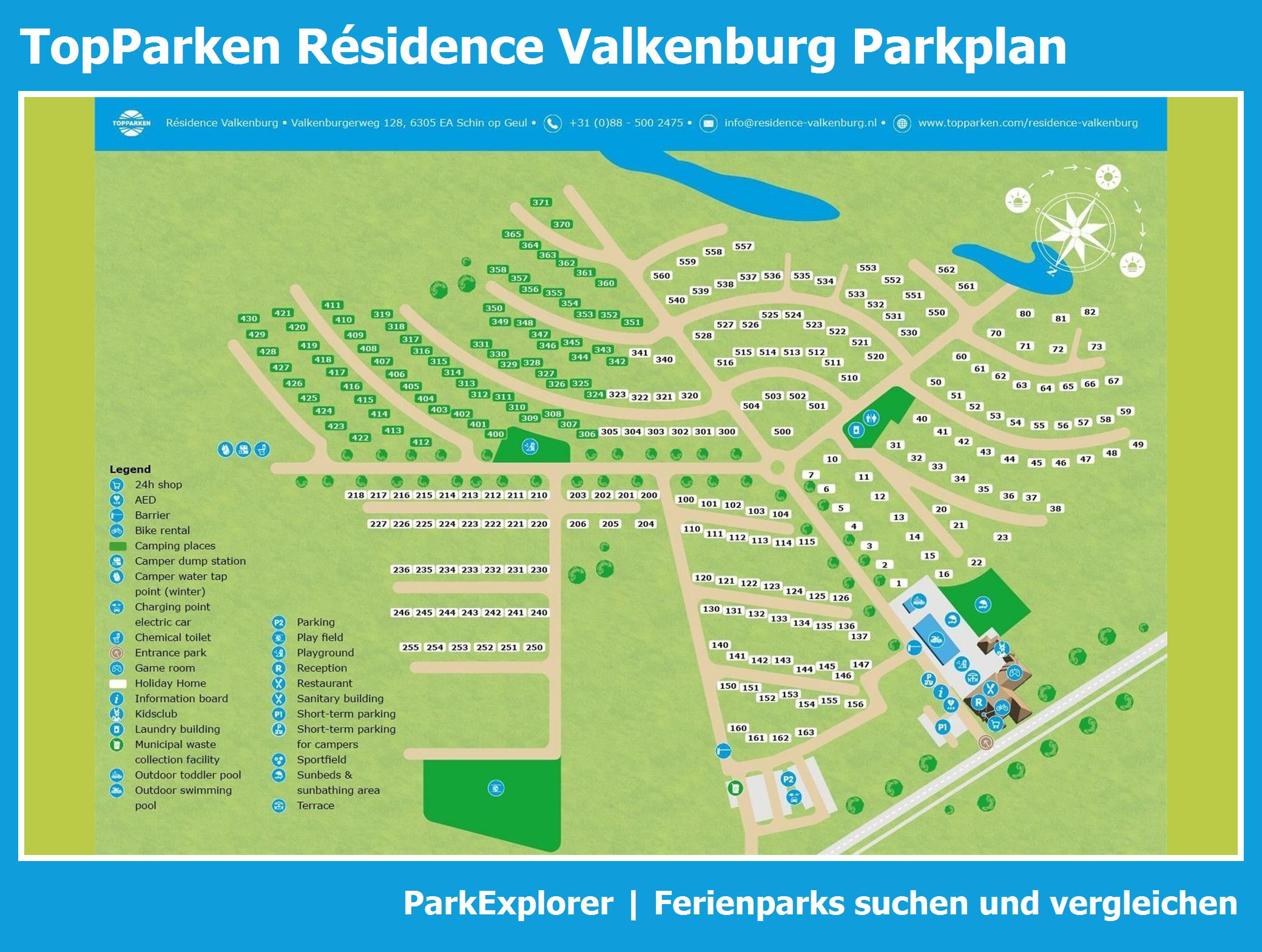Aktueller und übersichtlicher Parkplan von TopParken Résidence Valkenburg mit alle Unterkünfte und Einrichtungen, auch als PDF herunterladbar.