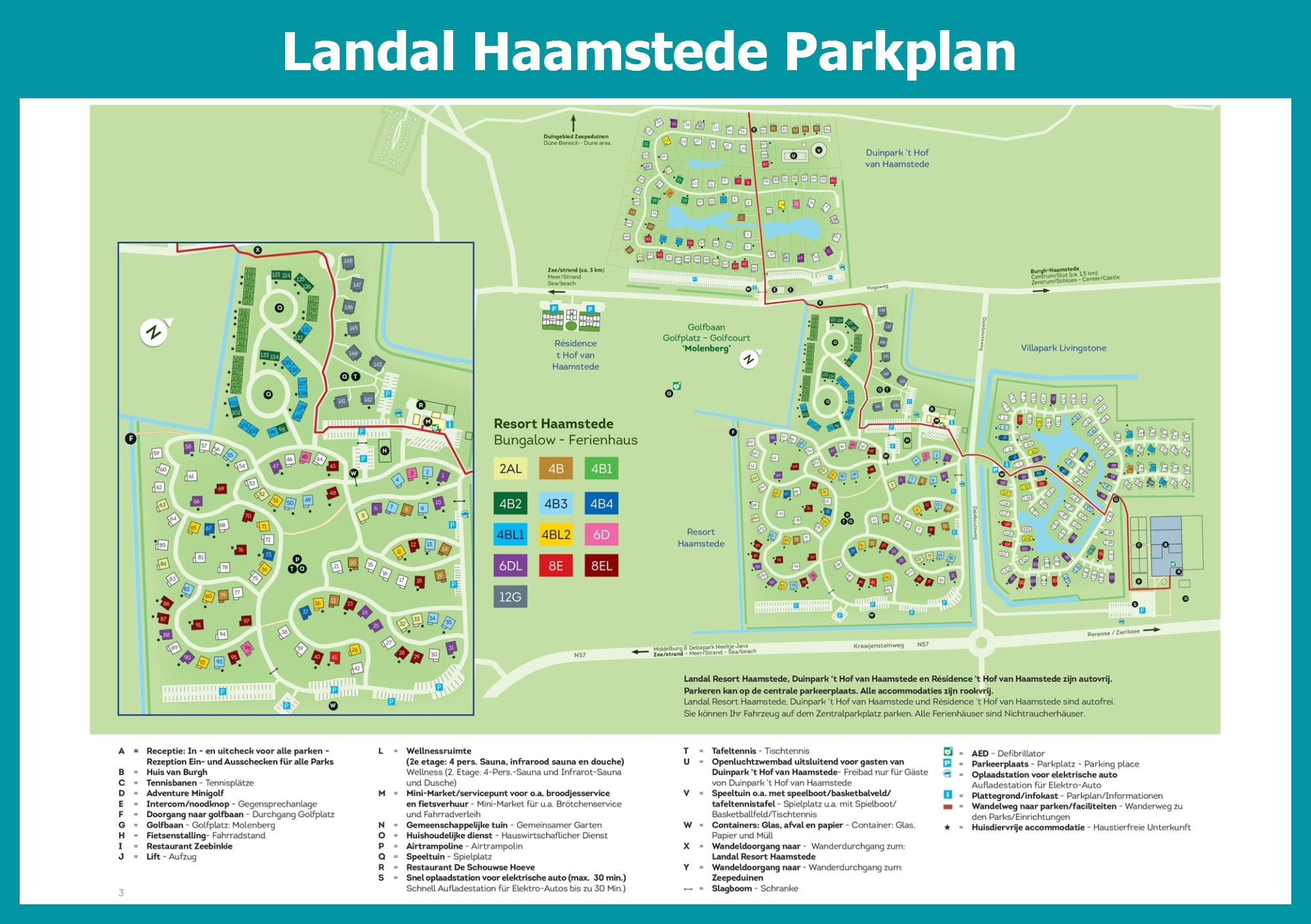 Aktueller und übersichtlicher Parkplan von Landal Haamstede mit alle Unterkünfte und Einrichtungen, auch als PDF herunterladbar.
