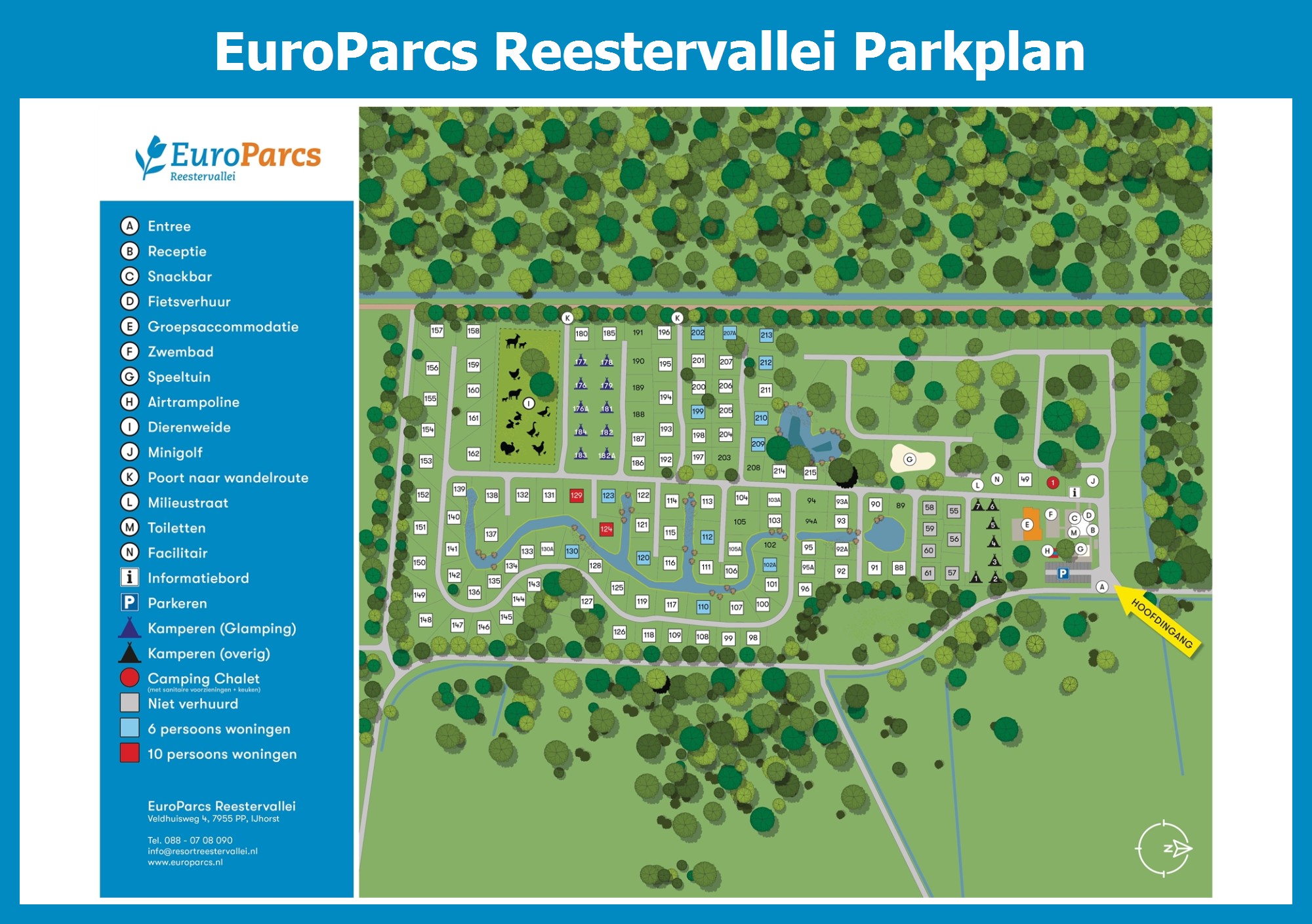 Aktueller und übersichtlicher Parkplan von EuroParcs Reestervallei mit alle Unterkünfte und Einrichtungen, auch als PDF herunterladbar.