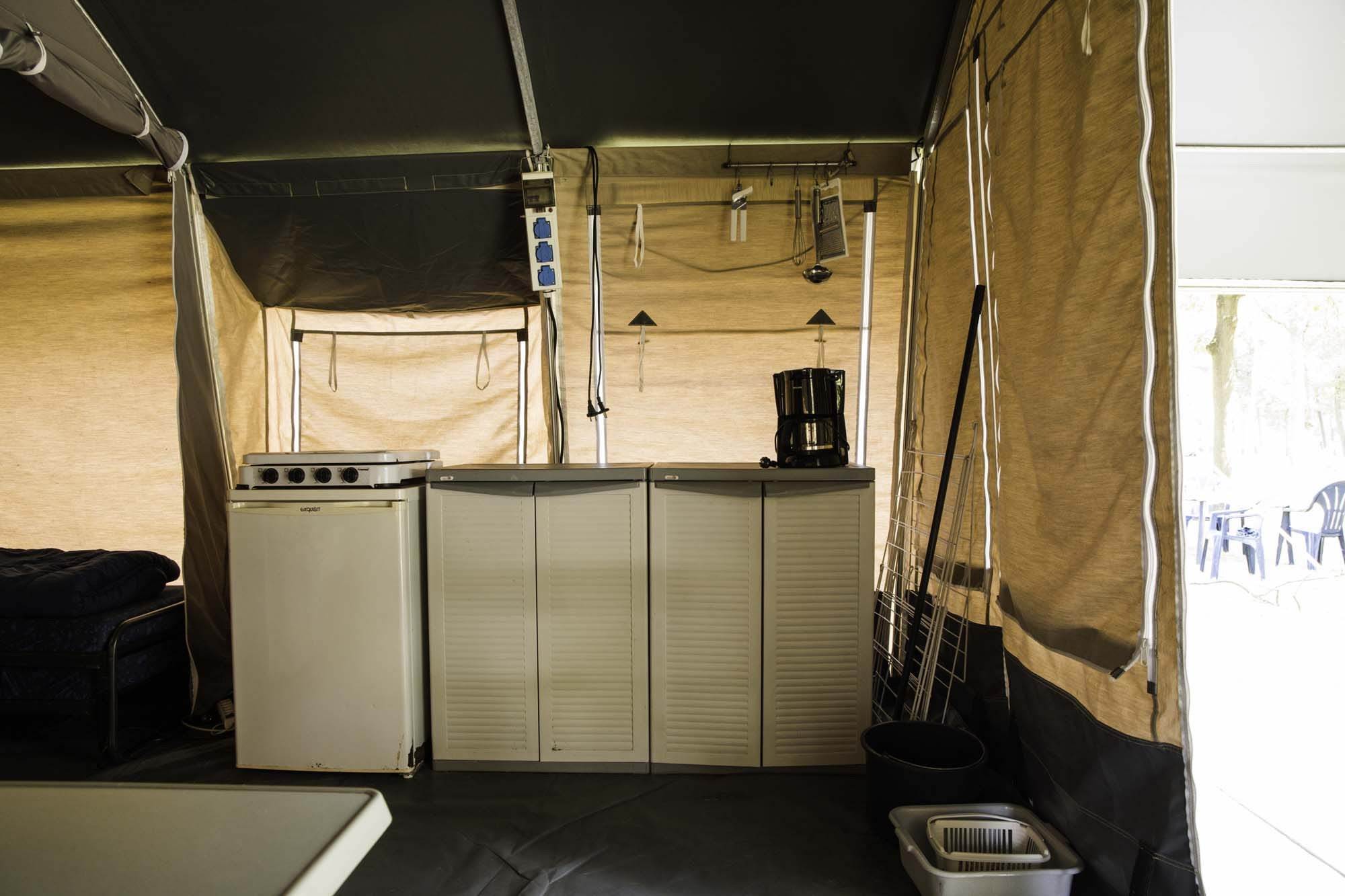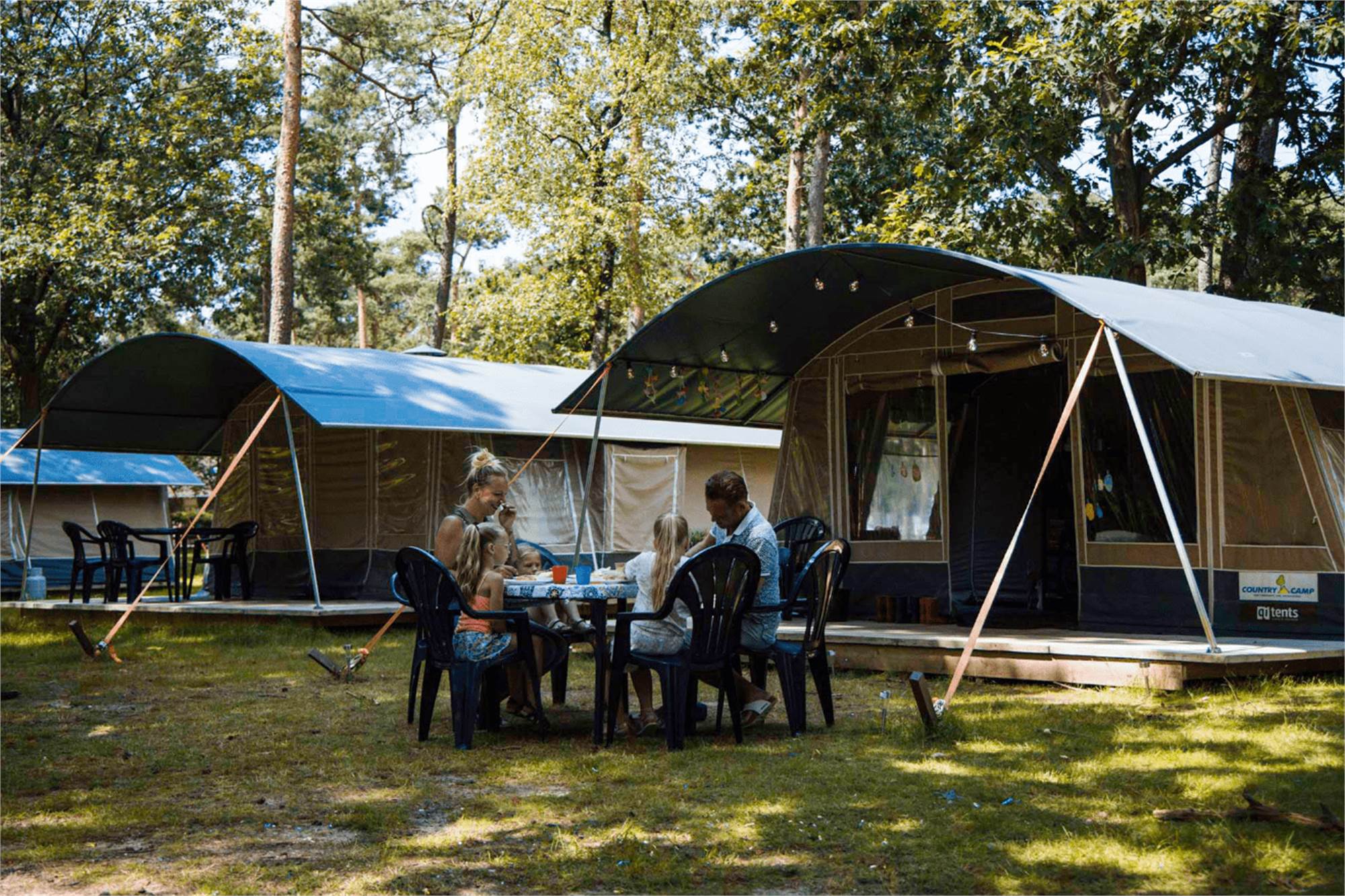 Die Country Camp Lodge ist ein modern gestaltetes Tunnelzelt mit Innenmaßen von 5x5 Metern und einer Markise von 2 Metern Tiefe über die gesamte Breite! Insgesamt 35m². Der Innenraum ist sehr komplett. Alles, was Sie für einen schönen Aufenthalt auf dem Campingplatz benötigen, ist vorhanden: vom Kartoffelschäler, Korkenzieher, über den Kühlschrank bis hin zum Sessel...... Und last but not least: schöne Betten mit Bettdecken und Kissen!