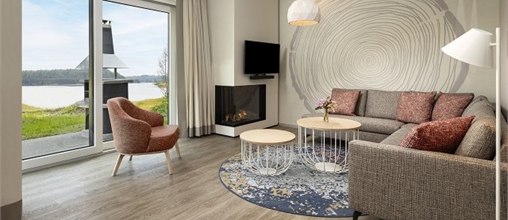 Von Ihrer überdachten Privatterrasse schweift Ihr Blick über den See. Alle Häuser des Typs Ferienhaus am See liegen direkt am Wasser. Das Panorama genießen Sie auch von innen durch die großen Fenster!