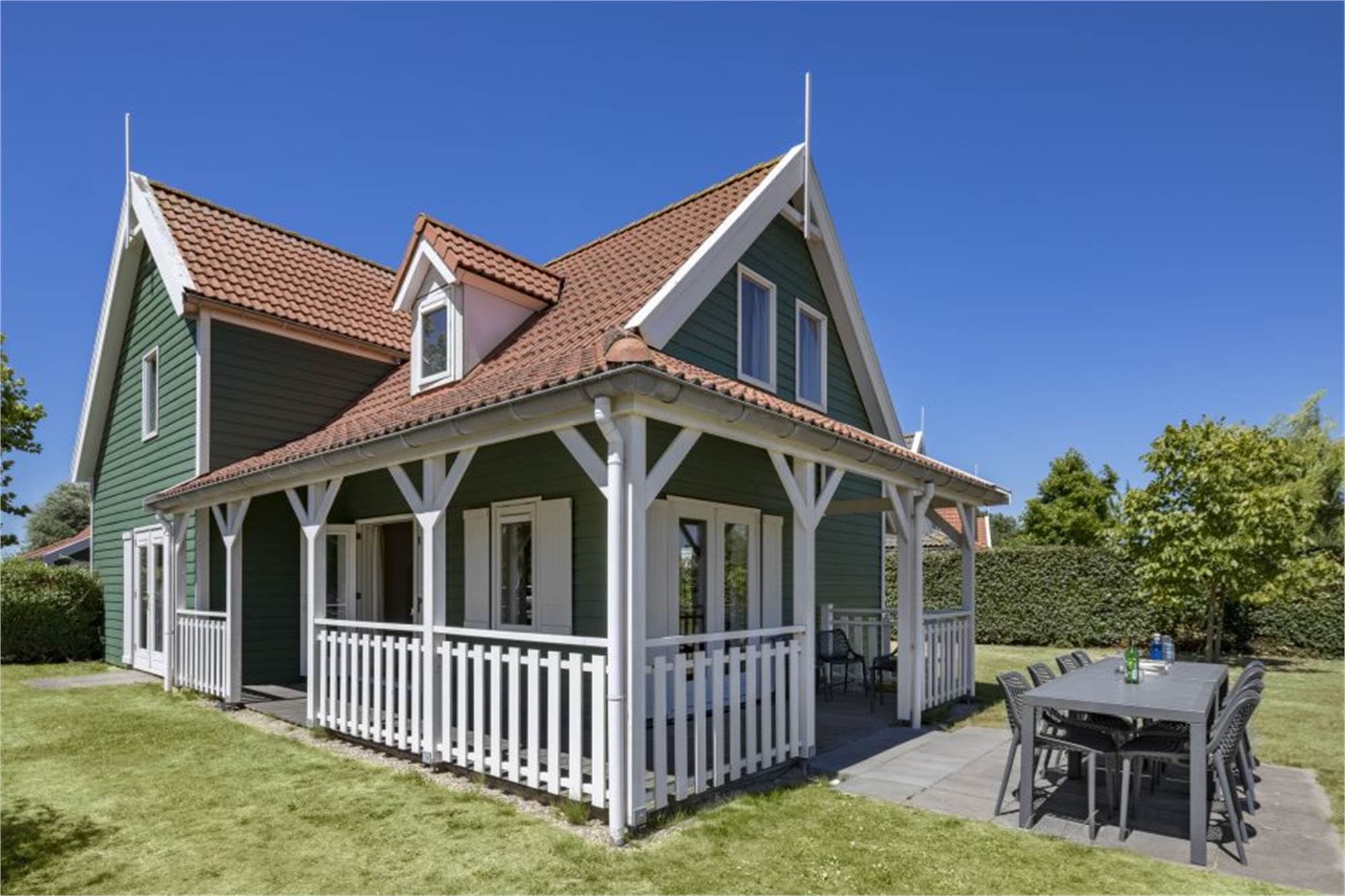 Diese freistehende Villa am Wasser eignet sich für 12 Personen. Das stilvolle Wohnzimmer ist mit Smart-TV und Flügeltüren ausgestattet. Die angrenzende Küche verfügt u. a. über Kaffeemaschine, Geschirrspüler, Mikrowelle und Kühlschrank mit Gefrierfach. Im Abstellraum befindet sich ein weiterer Kühlschrank mit Gefrierfach. Im Erdgeschoss finden Sie außerdem ein Schlafzimmer, ein Badezimmer mit Dusche und eine separate Toilette. Im Obergeschoss befinden sich die übrigen fünf Schlafzimmer mit je zwei extra langen Einzel-Boxspringbetten (90 x 120 cm) sowie zwei Badezimmer mit Dusche und Badewanne. Die Villa ist kinderfreundlich eingerichtet und bietet Treppengitter oben, einen Laufstall, ein Kinderbett und einen Kinderstuhl. Im Außenbereich finden Sie eine möblierte Veranda sowie eine Parkmöglichkeit für ein Auto. Die Nutzung von WiFi ist gratis und Haustiere sind gestattet.