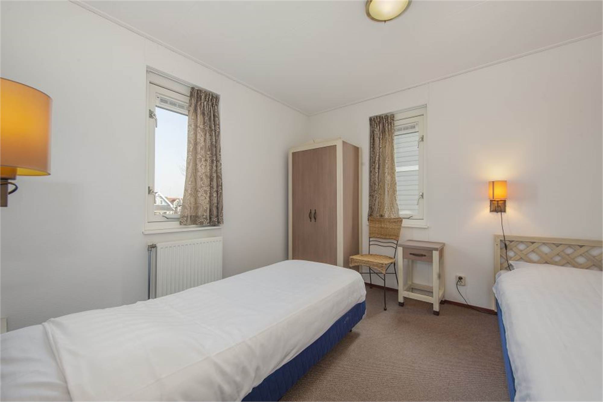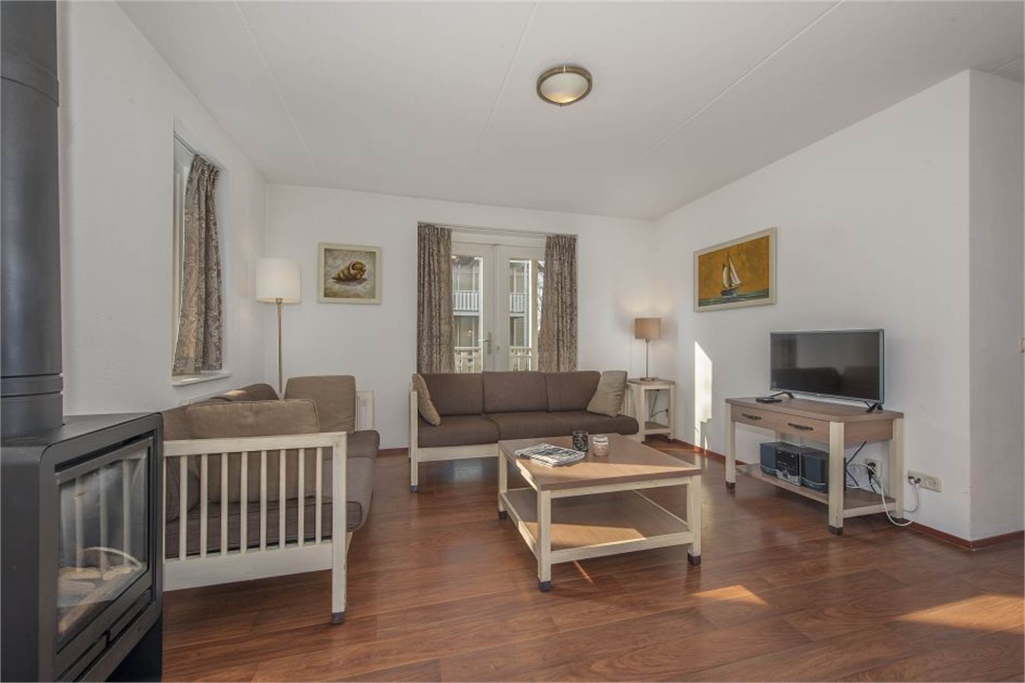 Dieses Landhaus eignet sich für 6 Personen. Im Erdgeschoss befindet sich ein großer Wohnbereich mit (Gas)Ofen oder offenem Kamin, CD-Player, DVD-Player und Flügeltüren zur Veranda. Küche mit Mikrowelle, Kaffeemaschine, Wasserkocher und Geschirrspüler. Außerdem gibt es eine zweite Toilette und einen separaten Abstellraum. Im ersten Obergeschoss befinden sich drei Schlafzimmer mit je zwei Einzel-Boxspringbetten. Badezimmer mit Badewanne, Dusche und Sauna. Generell ist eine Kinderbadewanne, ein Laufstall, ein Kinderbett sowie ein Kinderstuhl vorhanden.