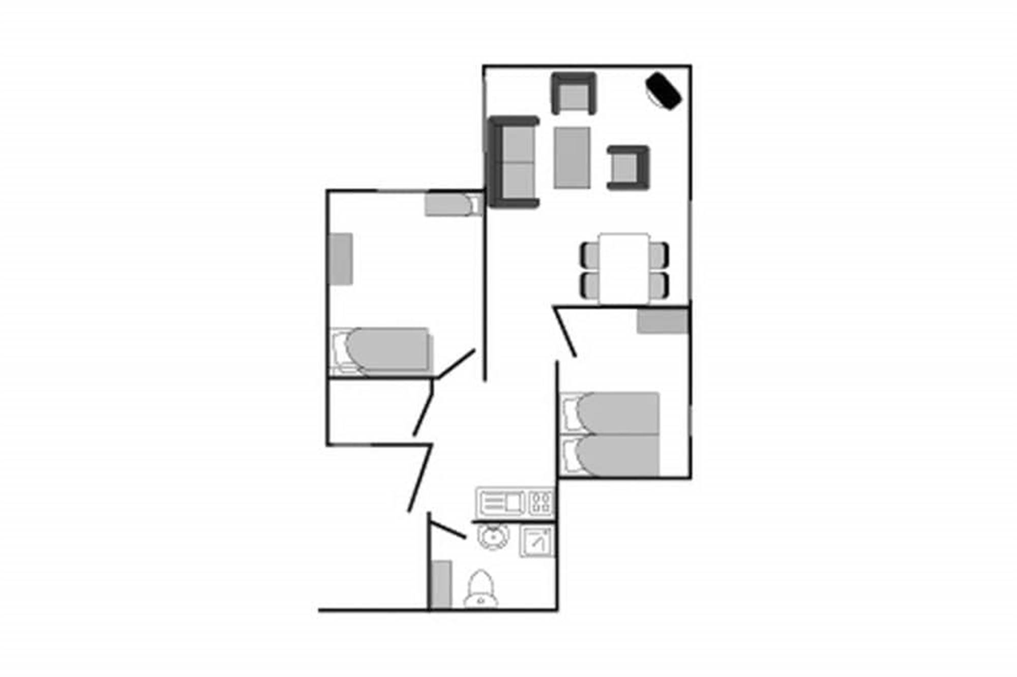 Einteilung: Wohnzimmer mit Flatscreen-TV und DVD-Spieler, offene Küche mit Mikrowelle und Kühlschrank. Badezimmer mit Dusche, Waschtisch und Toilette. Zwei Schlafzimmer, davon eines mit zwei Einzelbetten und eines mit Kinder-Etagenbett und Kinderspielzeug. Terrasse mit verstellbaren Gartenmöbeln und Kissen.