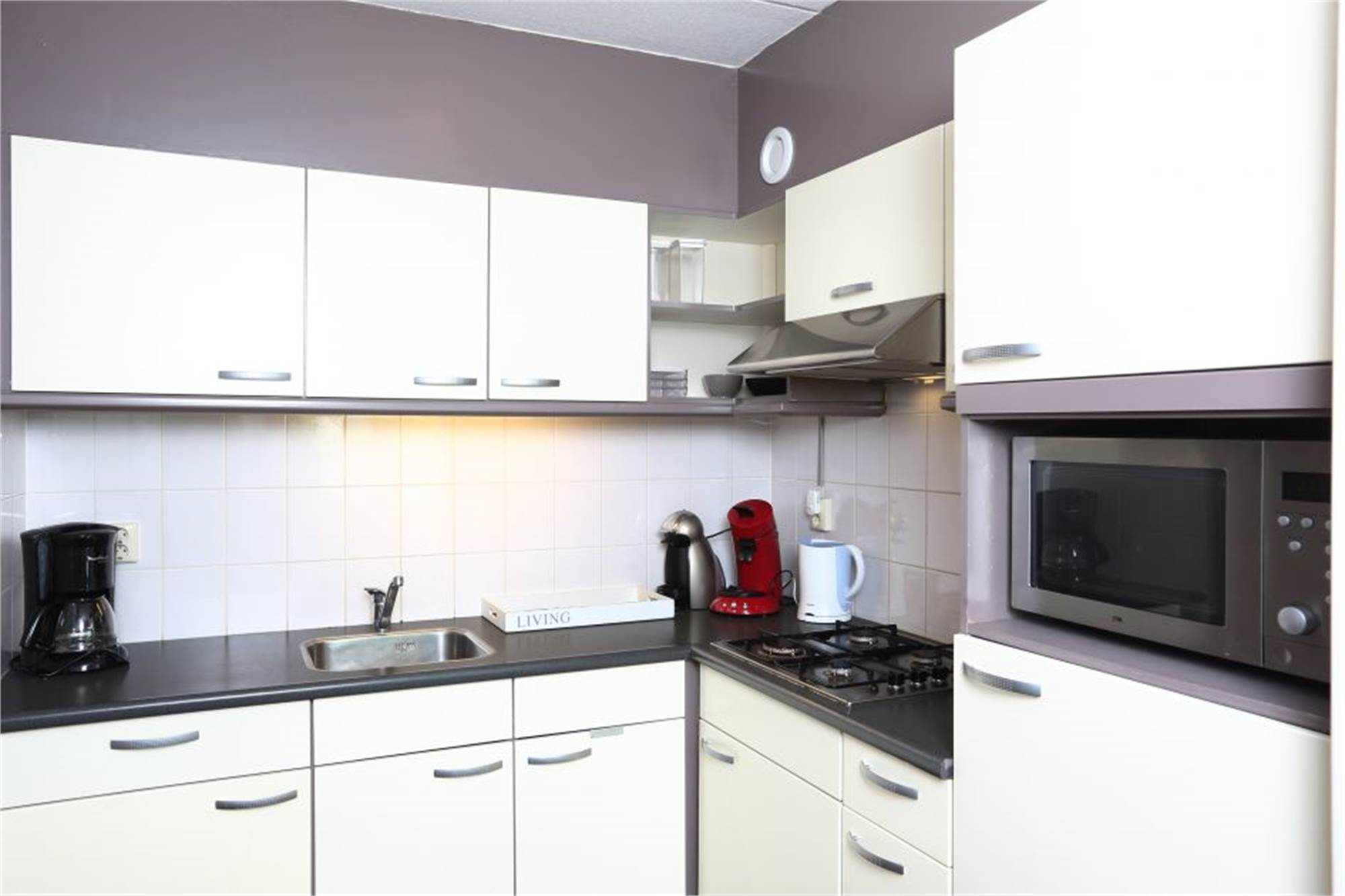Erdgeschoss: Wohnzimmer mit WiFi (gratis) und TV-Gerät mit deutschen Sendern. Offene Küche mit Kühlschrank mit Gefrierfach, Kaffeemaschine, Wasserkocher und Geschirrspüler. Badezimmer mit Duschkabine.