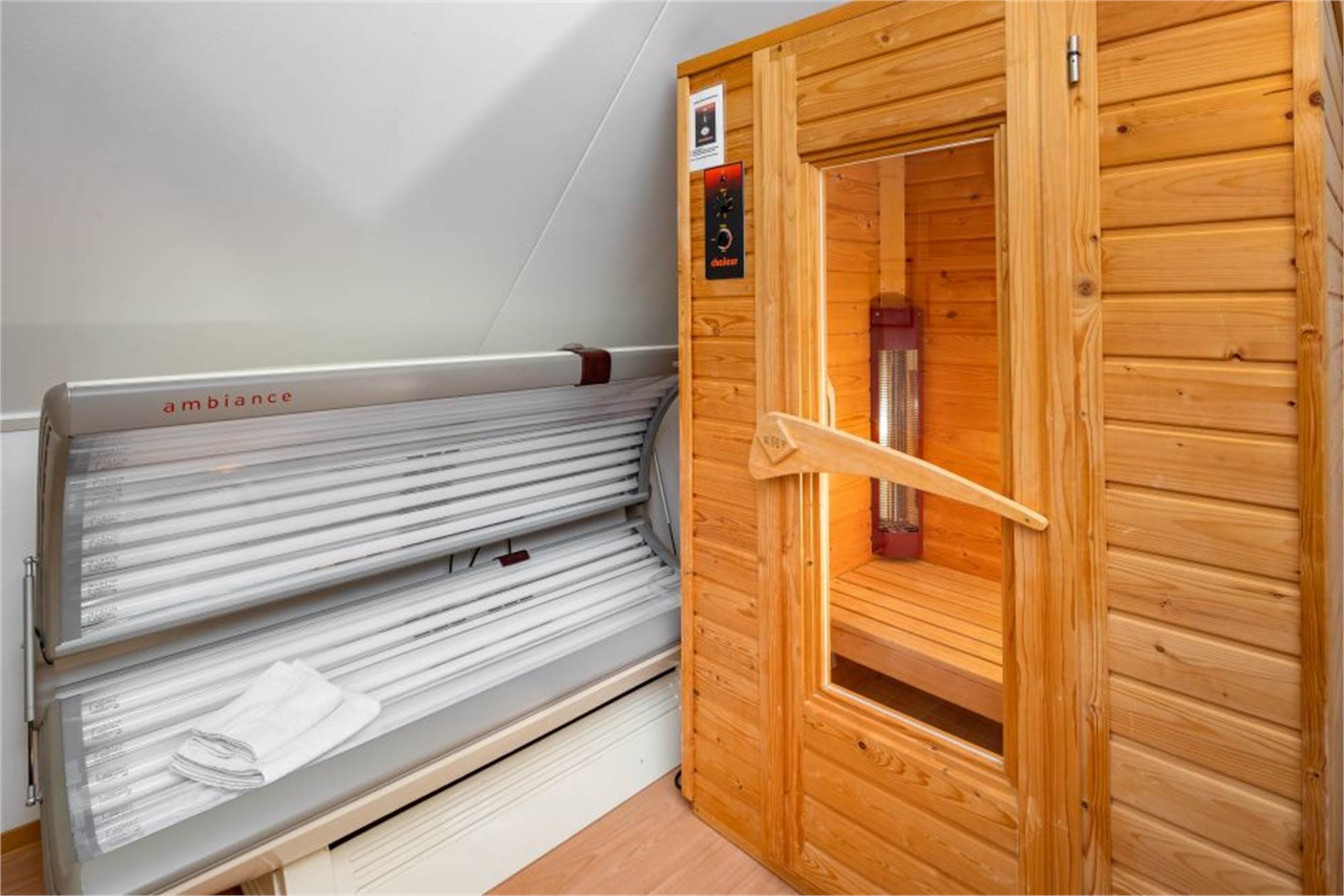 Obergeschoss: zwei Schlafzimmer, davon eins mit Waschtisch und zwei Einzel-Boxspringbetten. Das andere Schlafzimmer verfügt über ein Einzelbett, Infrarotsauna und Sonnenbank. An der Treppe kann ein Treppengitter befestigt werden.