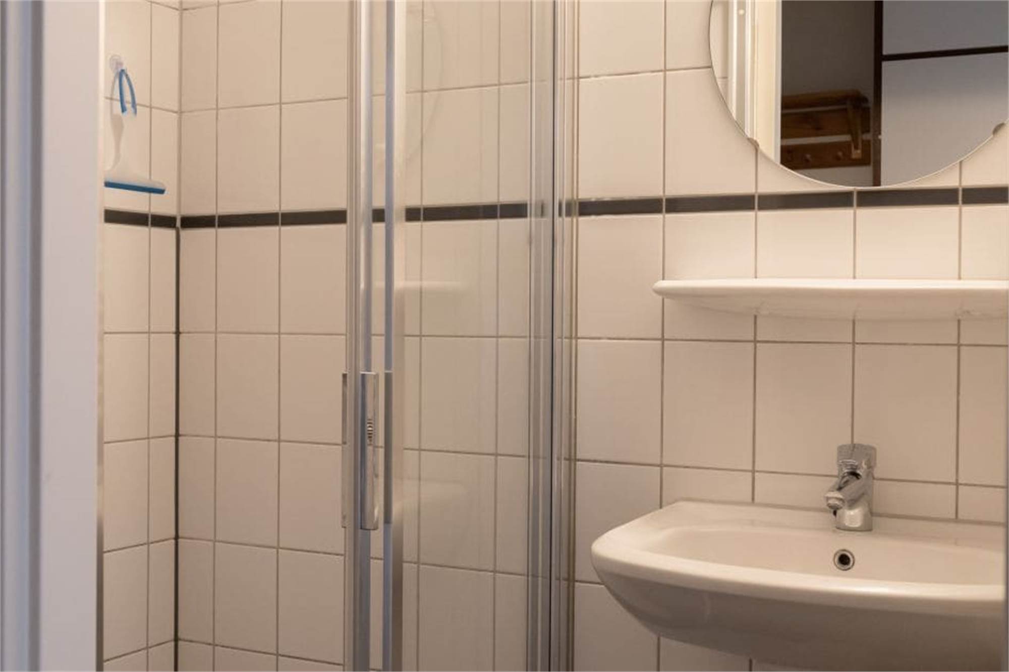 Erdgeschoss: Wohnzimmer mit komfortablen Mobiliar und Holzofen. Schiebetür zur möblierten Terrasse. Komplett eingerichtete Küche mit Kaffeepadsystem, Kombi-Mikrowelle und Geschirrspüler. Schlafzimmer mit zwei Einzel-Boxspringbetten nebeneinander. Badezimmer mit Waschtisch und Dusche. Separate Toilette. Offener Abstellraum am Eingang des Fahrradschuppens.