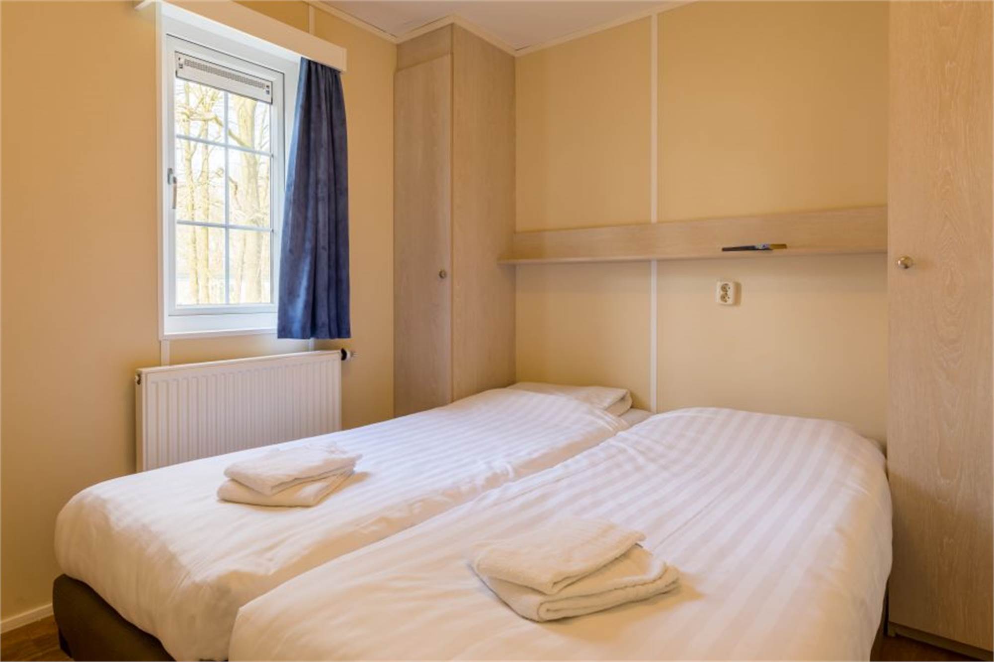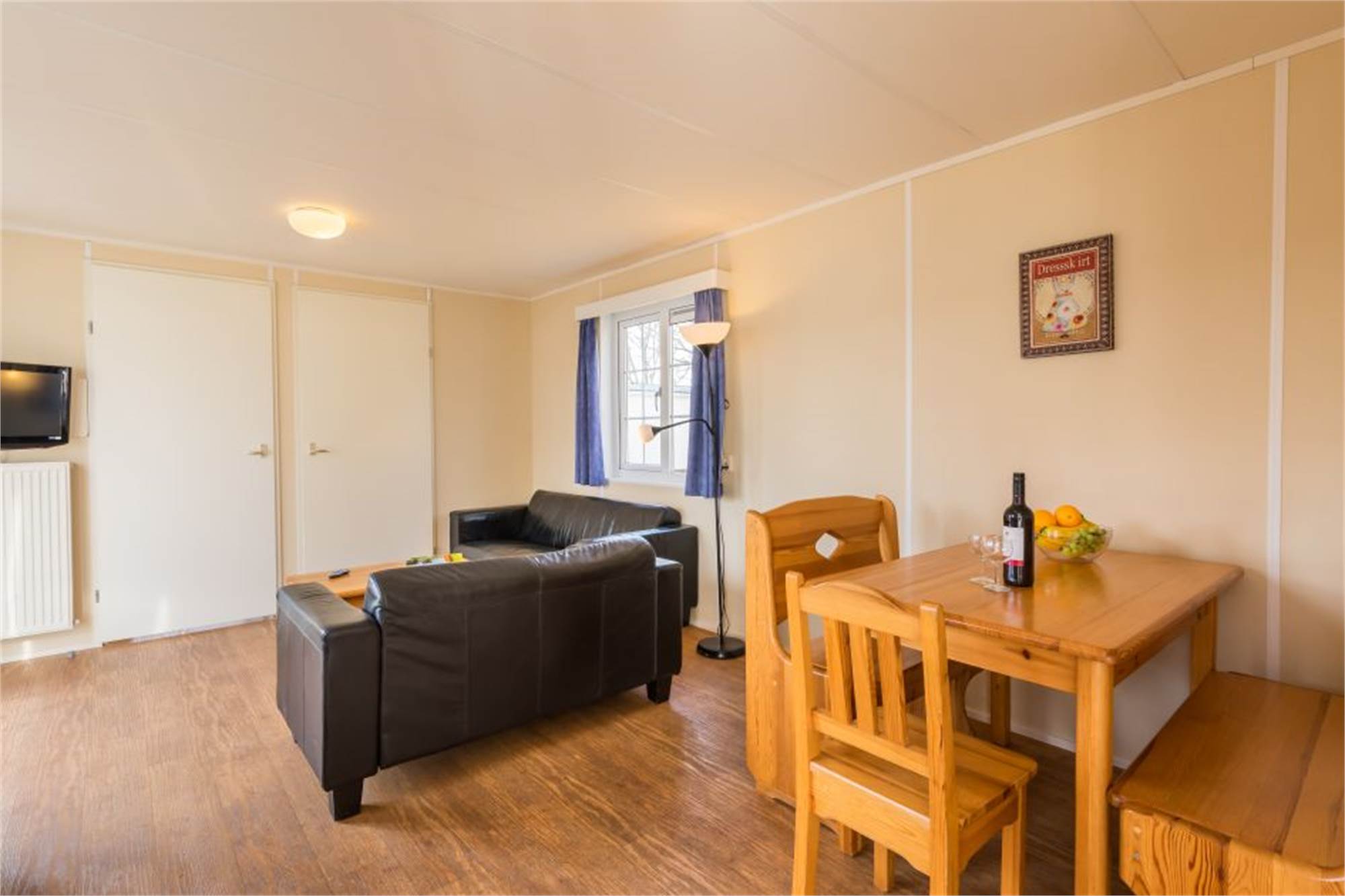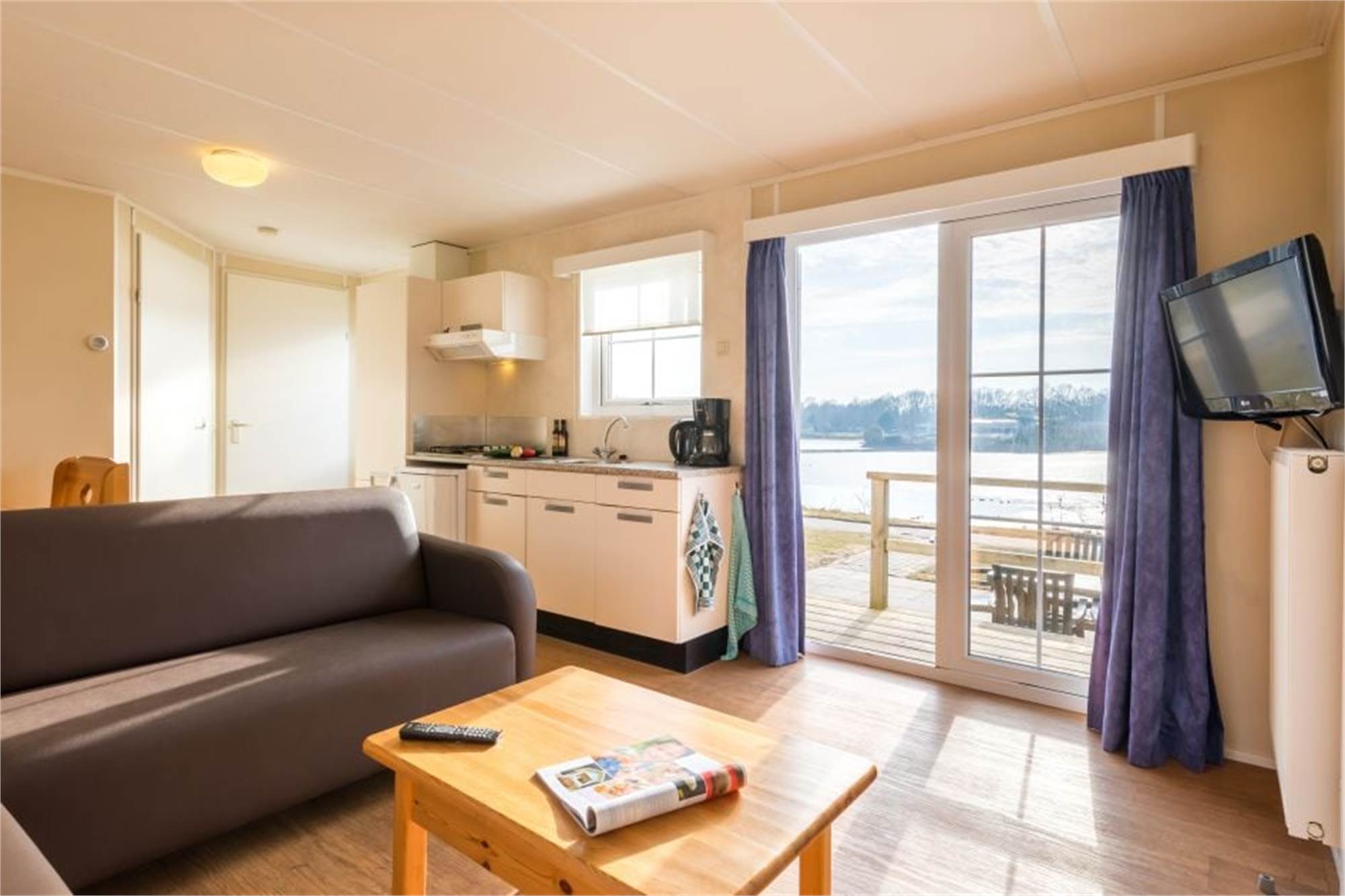 Dieses freistehende Chalet eignet sich für 5 Personen. Das Wohnzimmer verfügt über eine separate Sitzecke mit TV-Gerät. In der Küche finden Sie u. a. eine Filterkaffeemaschine. Es gibt 3 Schlafzimmer, eins davon mit je 2 Einzelbetten, eins mit 1 Einzelbett und eins mit Etagenbett und ein Badezimmer mit Dusche und Toilette. Das Chalet bietet außerdem eine Garten mit Gartenmöbel. Die Nutzung von WiFi ist gratis.