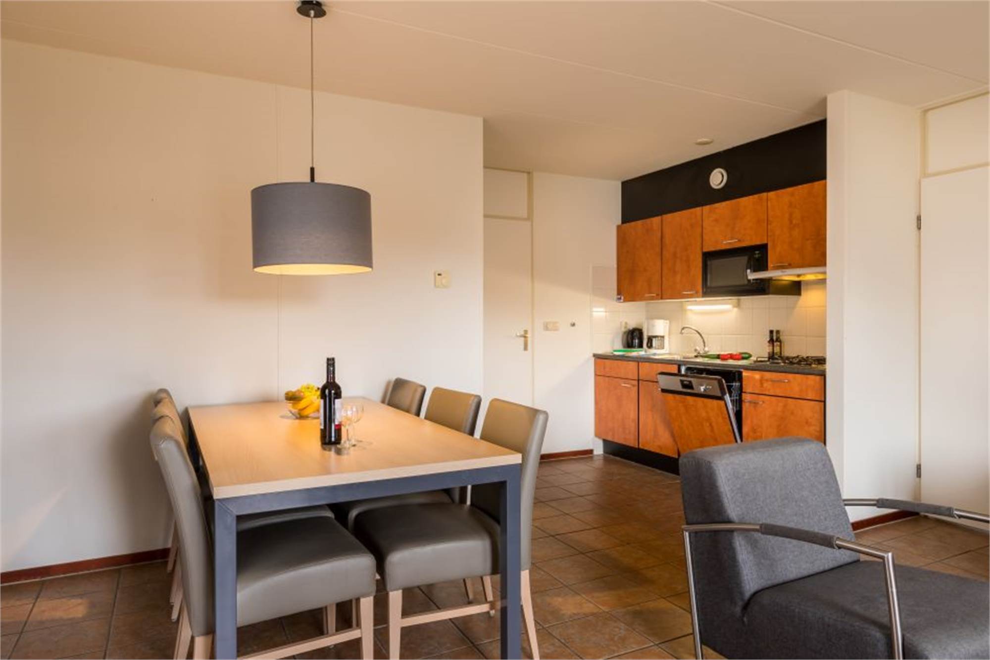 Dieser Bungalow eignet sich für 6 Personen. Das Wohnzimmer verfügt über einen offenen Kamin und die offene Küche ist u. a. mit Geschirrspüler, Mikrowelle und Kaffeemaschine ausgestattet. Außerdem gibt es 3 Schlafzimmer, davon zwei mit 2 Einzel-Boxspringbetten und eins mit Etagenbett sowie ein Badezimmer mit Dusche oder Badewanne. Im Außenbereich finden Sie einen möblierte Terrasse und die Nutzung von WiFi ist gratis.