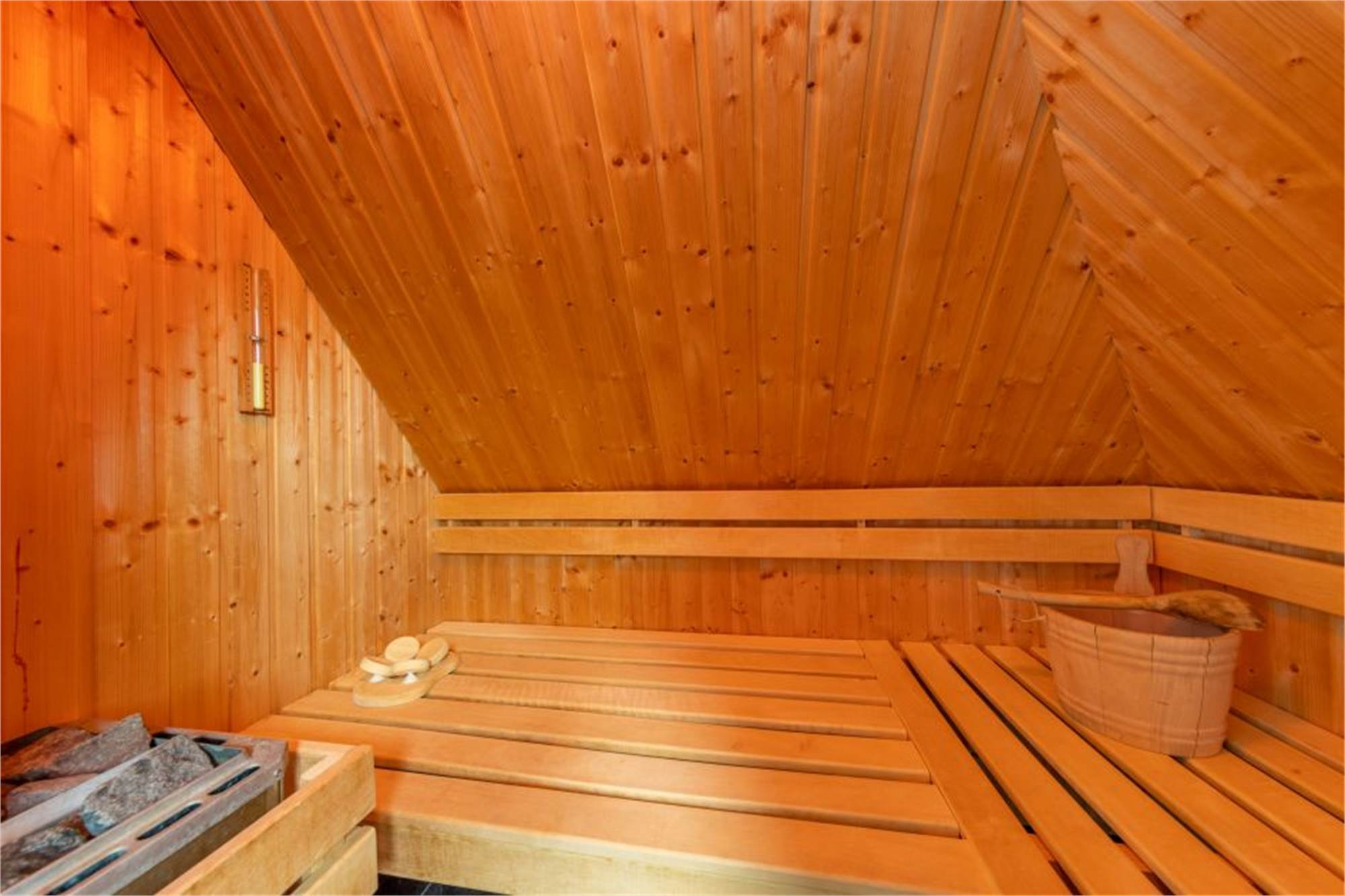 Obergeschoss: Zwei Schlafzimmer mit je zwei Einzel-Boxspringbetten. In einem der Schlafzimmer befindet sich eine traditionelle Sauna.