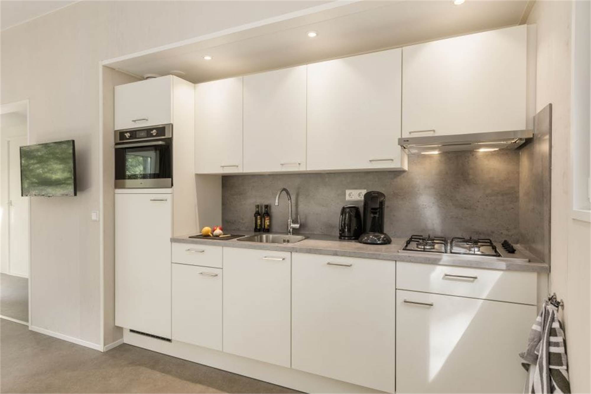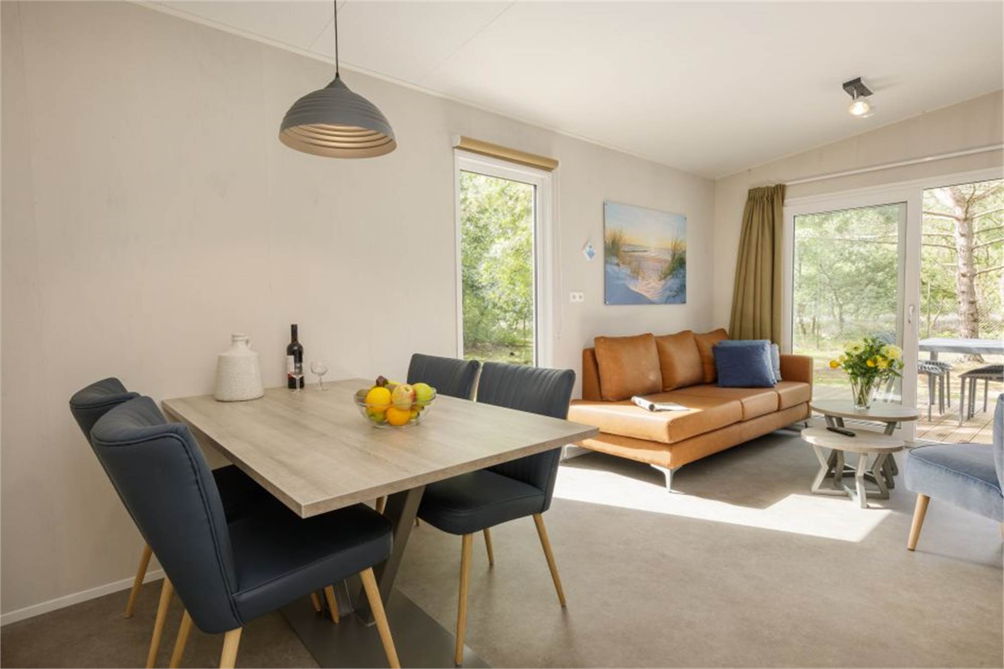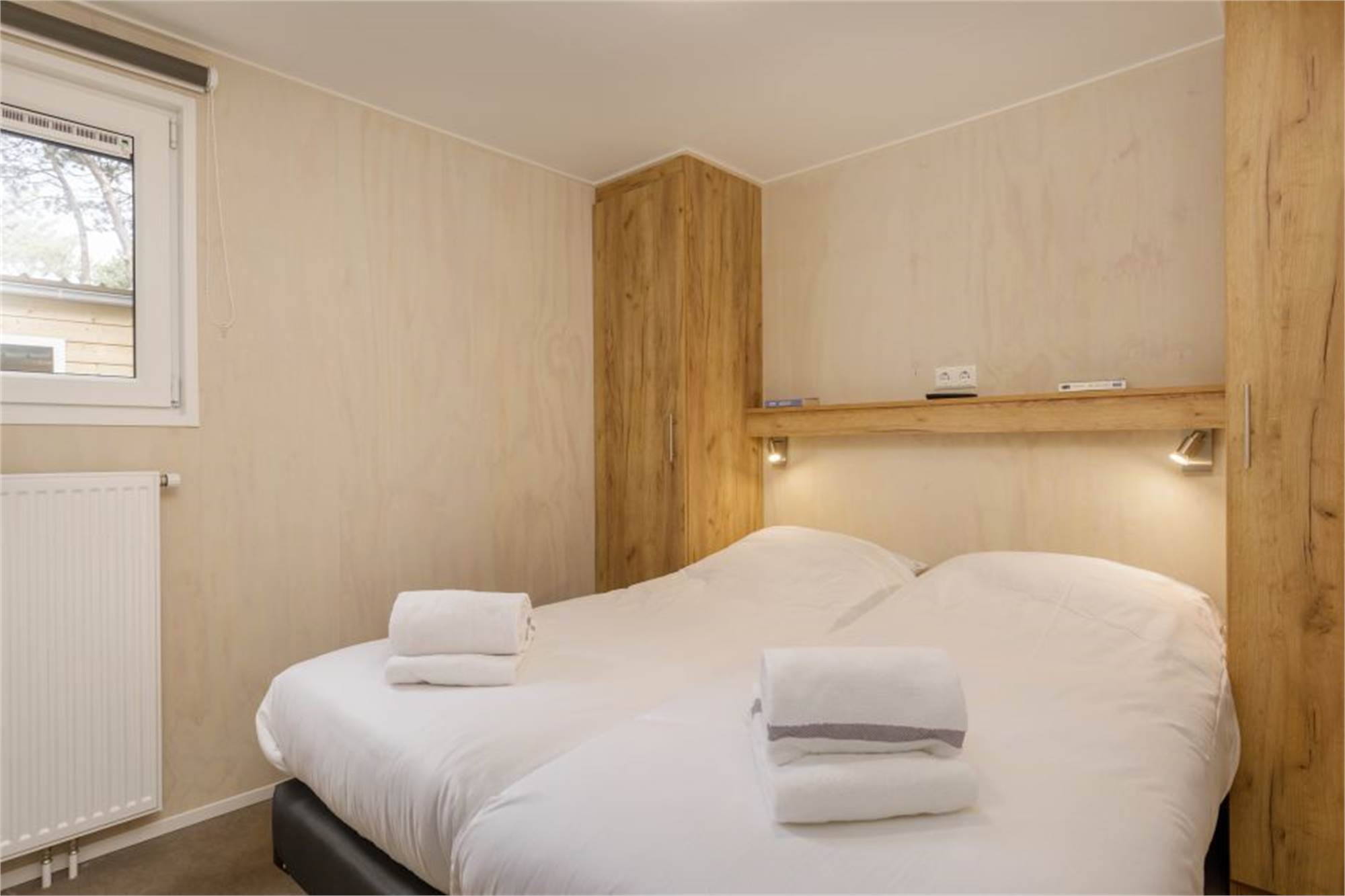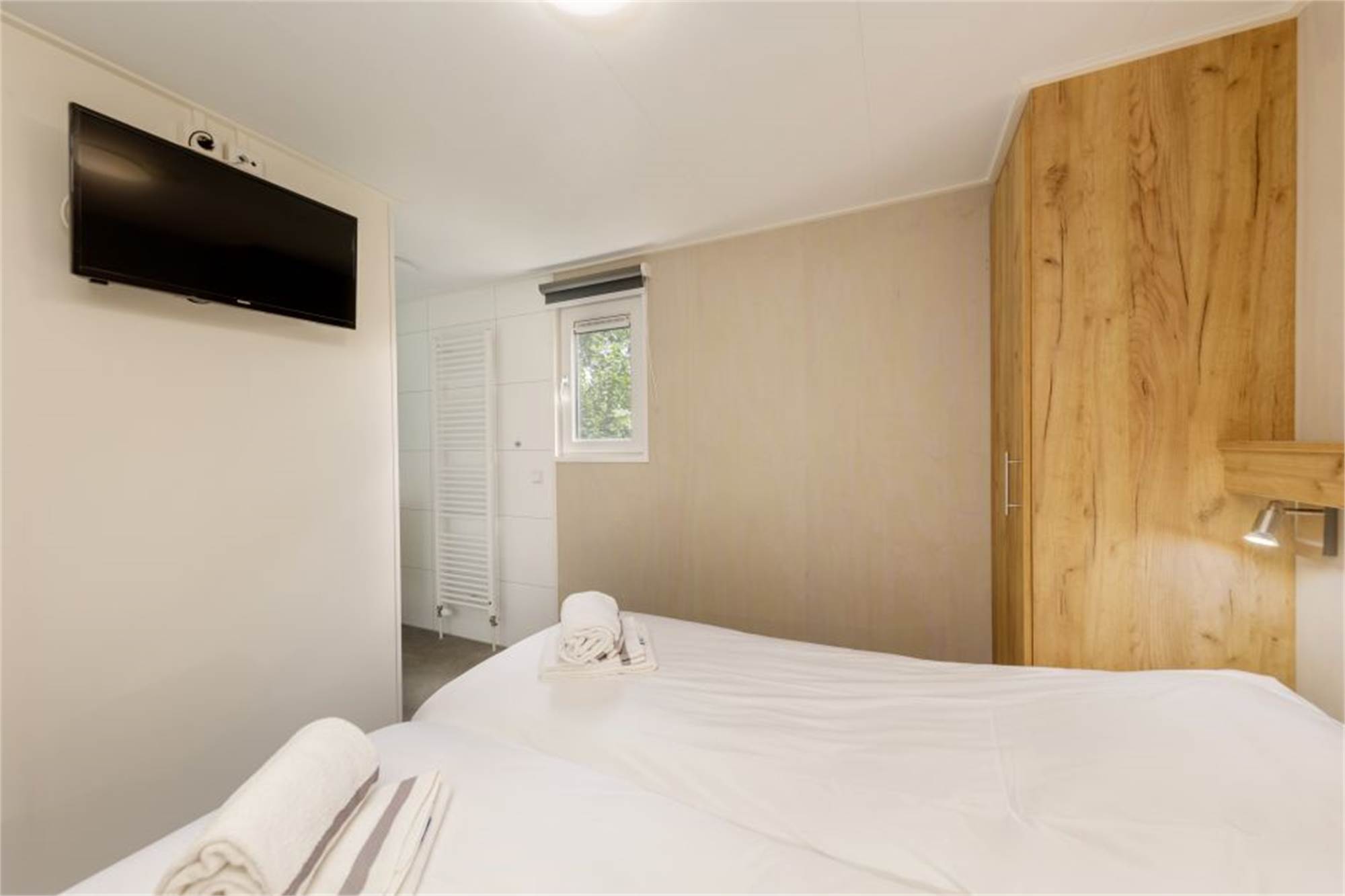Dieses neue und ebenerdige Chalet eignet sich für 4 Personen. Das Wohnzimmer ist mit Smart-TV ausgestattet und die Küche verfügt u. a. über Kombi-Mikrowelle, Geschirrspüler und Kaffeepadmaschine. Es gibt 2 Schlafzimmer mit je zwei Einzelbetten sowie 2 Badezimmer mit begehbarer Dusche und ein separates Gäste-WC. Im Außenbereich befindet sich eine Terrasse mit Gartenmöbeln.