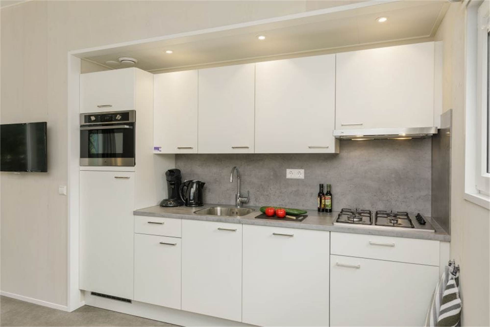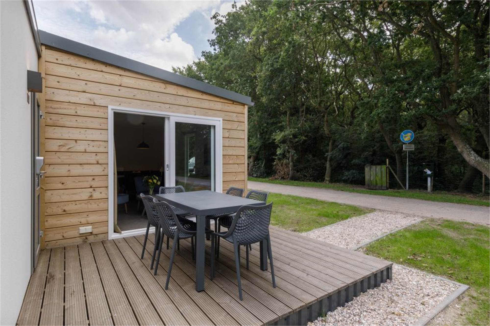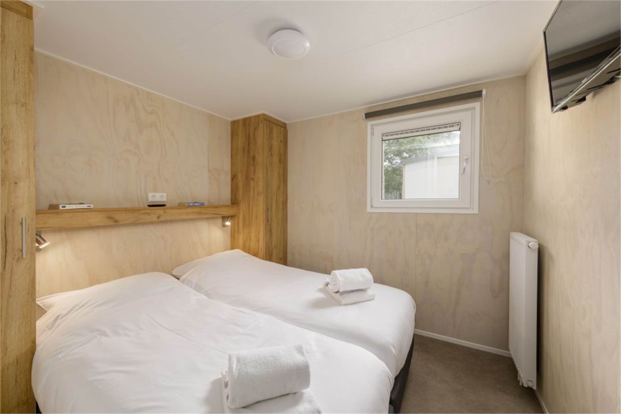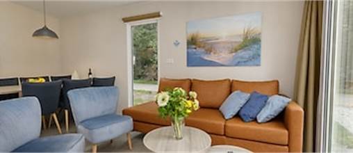Dieses neue und ebenerdige Chalet eignet sich für 6 Personen. Das Wohnzimmer ist mit Smart-TV ausgestattet und die Küche verfügt u. a. über Kombi-Mikrowelle und Geschirrspüler. Es gibt 3 Schlafzimmer mit je zwei Einzelbetten sowie 1 Badezimmer mit begehbarer Dusche und ein separates Gäste-WC. Im Außenbereich befindet sich eine Terrasse mit Gartenmöbeln.