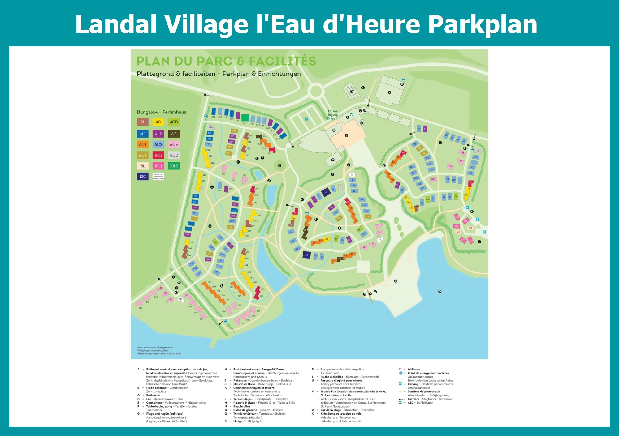 Aktueller und übersichtlicher Parkplan von Landal Village l'Eau d'Heure mit alle Unterkünfte und Einrichtungen, auch als PDF herunterladbar.