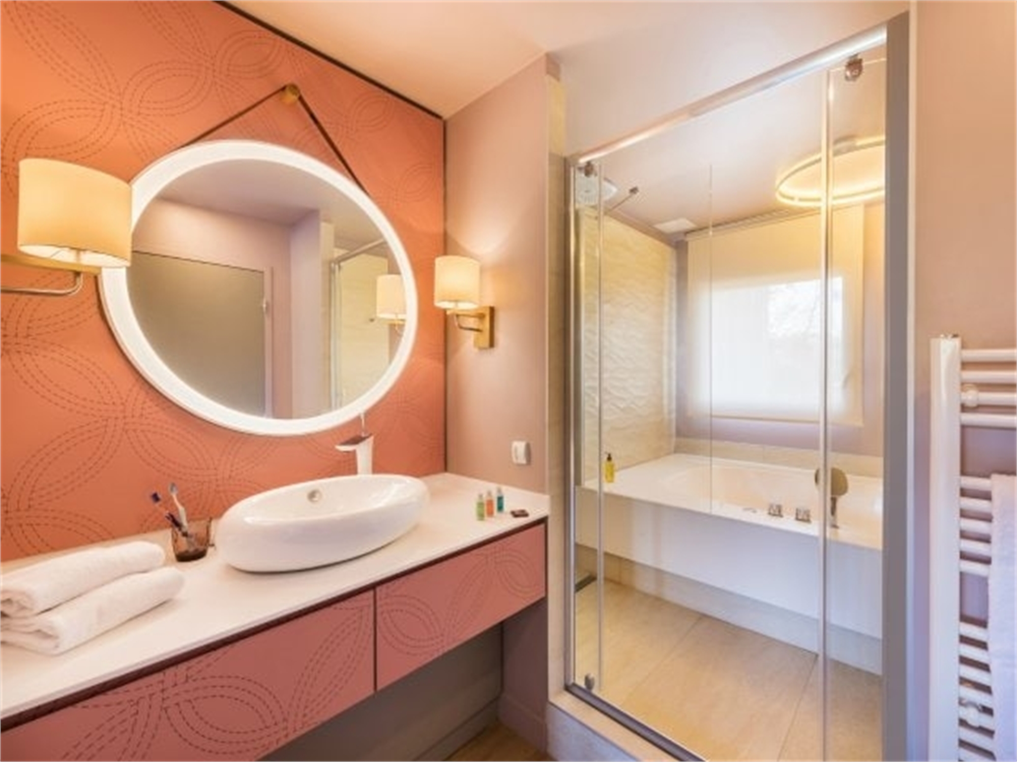 4 Badezimmer im ersten Stock : 2 Wellness-Badezimmer mit Badewanne mit Whirlpool-Funktion, Massagedusche, großes Fenster, sorgfältig platziert, um die Privatsphäre zu gewährleisten. 2 mit Dusche, WC. 2 Fön