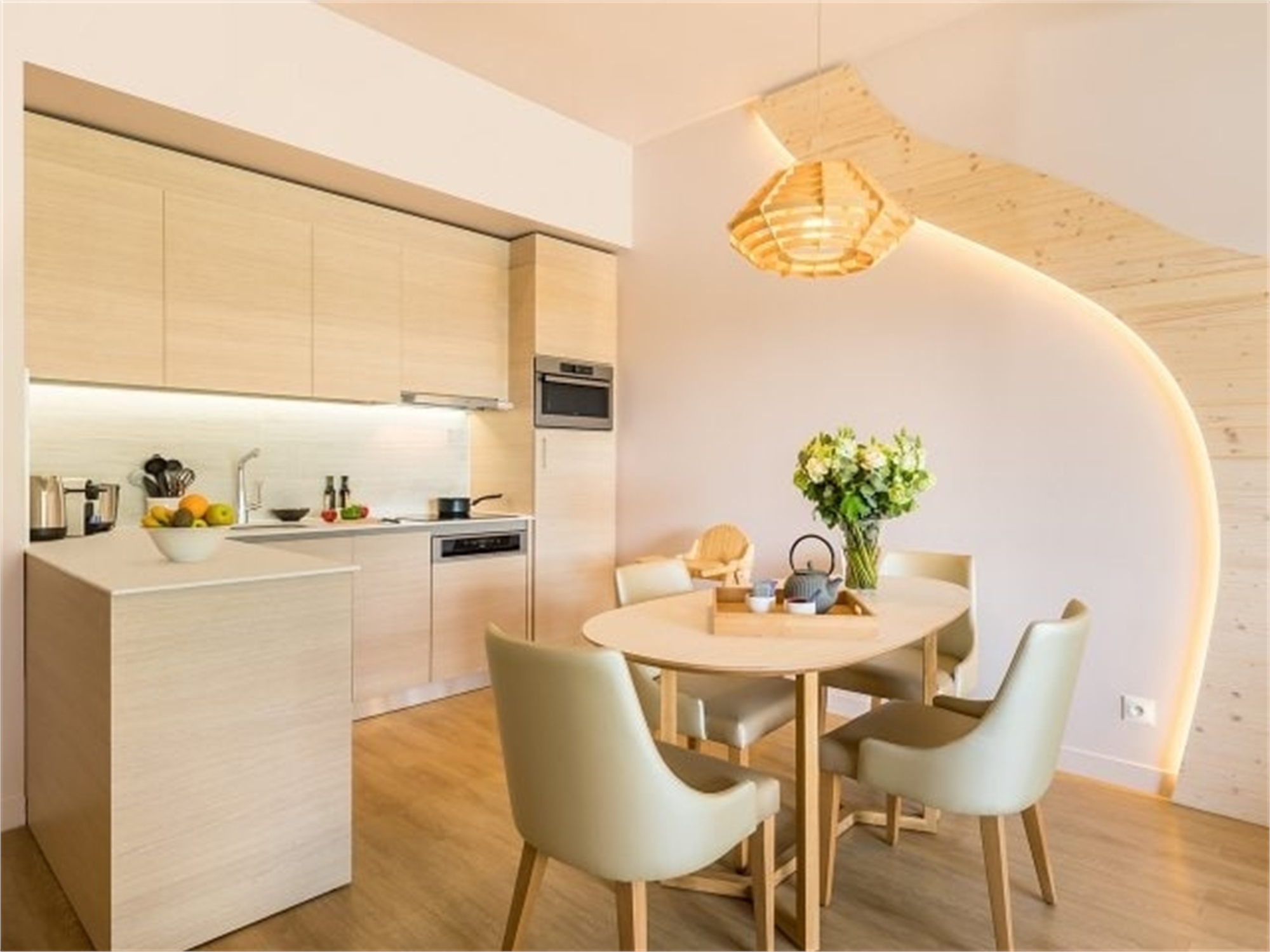 Voll ausgestattete amerikanische Küche: Geschirr, Geschirrspülmaschine, Spülset, Mikrowelle mit Grillfunktion, Induktionsherd (4 Kochstellen), Dunstabzugshaube, Kühlschrank, Filterkaffeemaschine, Nespresso-Kaffeemaschine, Wasserkocher, Toaster, Abfallbehälter für die Mülltrennung