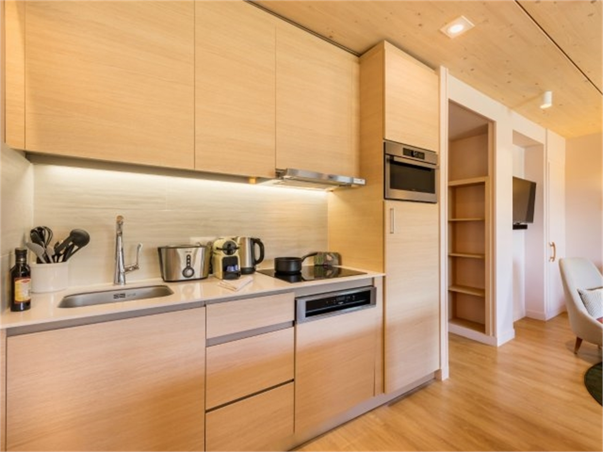 Voll ausgestattete amerikanische Küche: Geschirr, Geschirrspülmaschine, Spülset, Mikrowelle mit Grillfunktion, Induktionsherd (4 Kochstellen), Dunstabzugshaube, Kühlschrank, Filterkaffeemaschine, Nespresso-Kaffeemaschine, Wasserkocher, Toaster, Abfallbehälter für die Mülltrennung