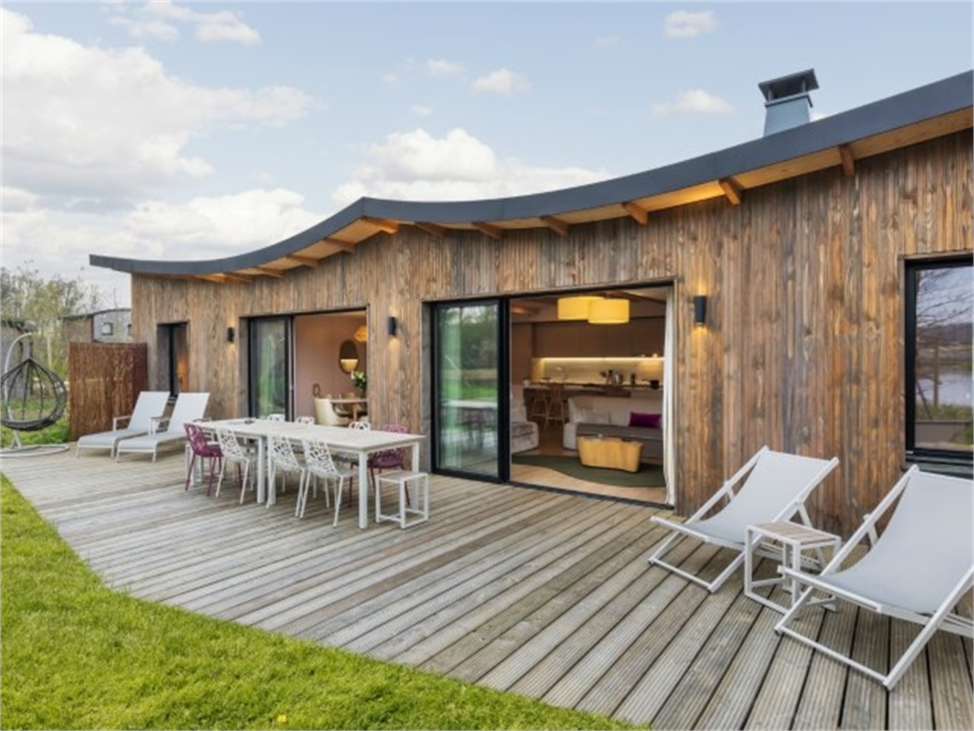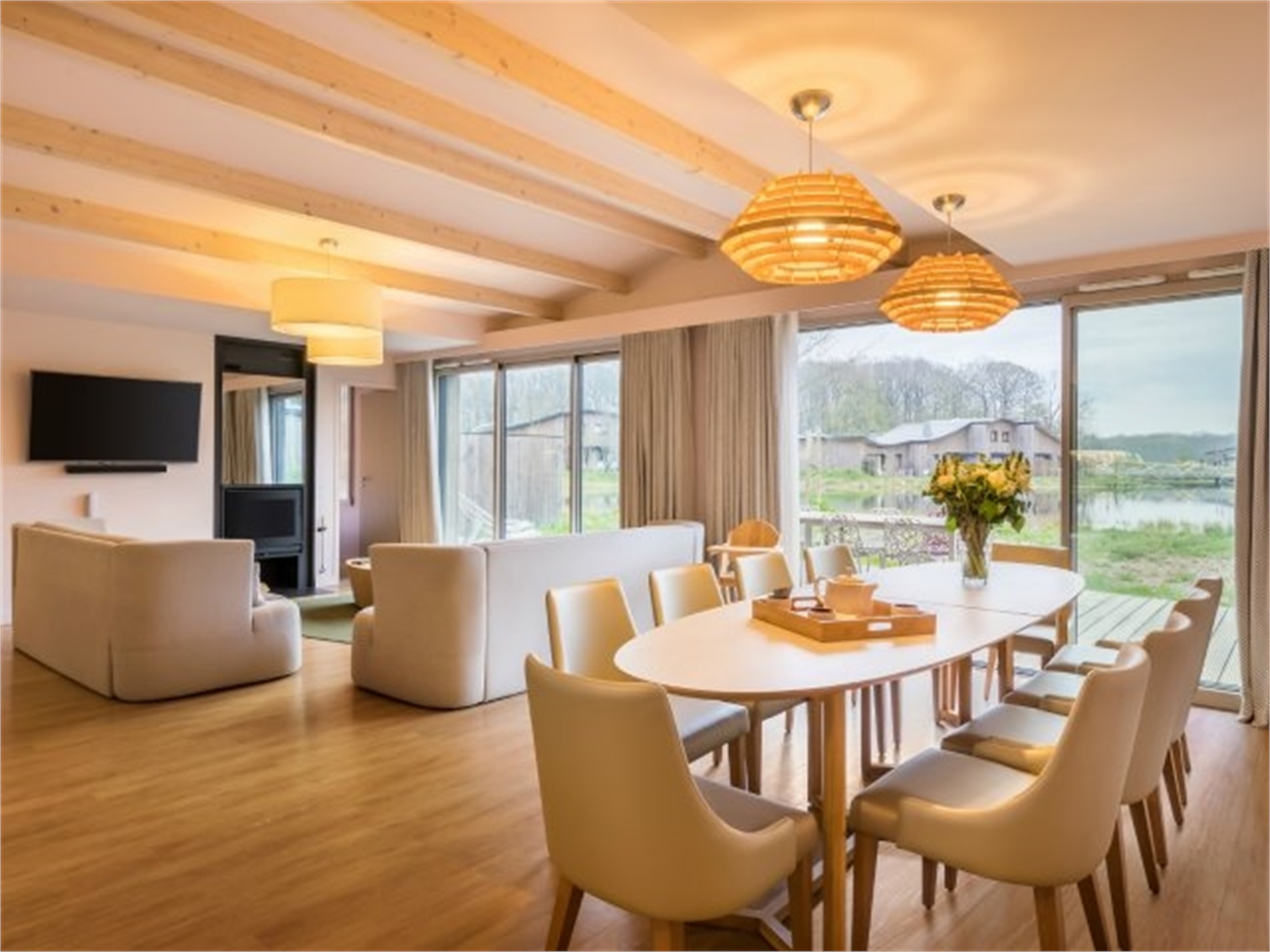 Wohnzimmer mit Offener Kamin, Flachbild-Fernseher. Große bodentiefe Fenster mit Blick auf die Holzterrasse, ausgestattet mit Gartenmöbeln