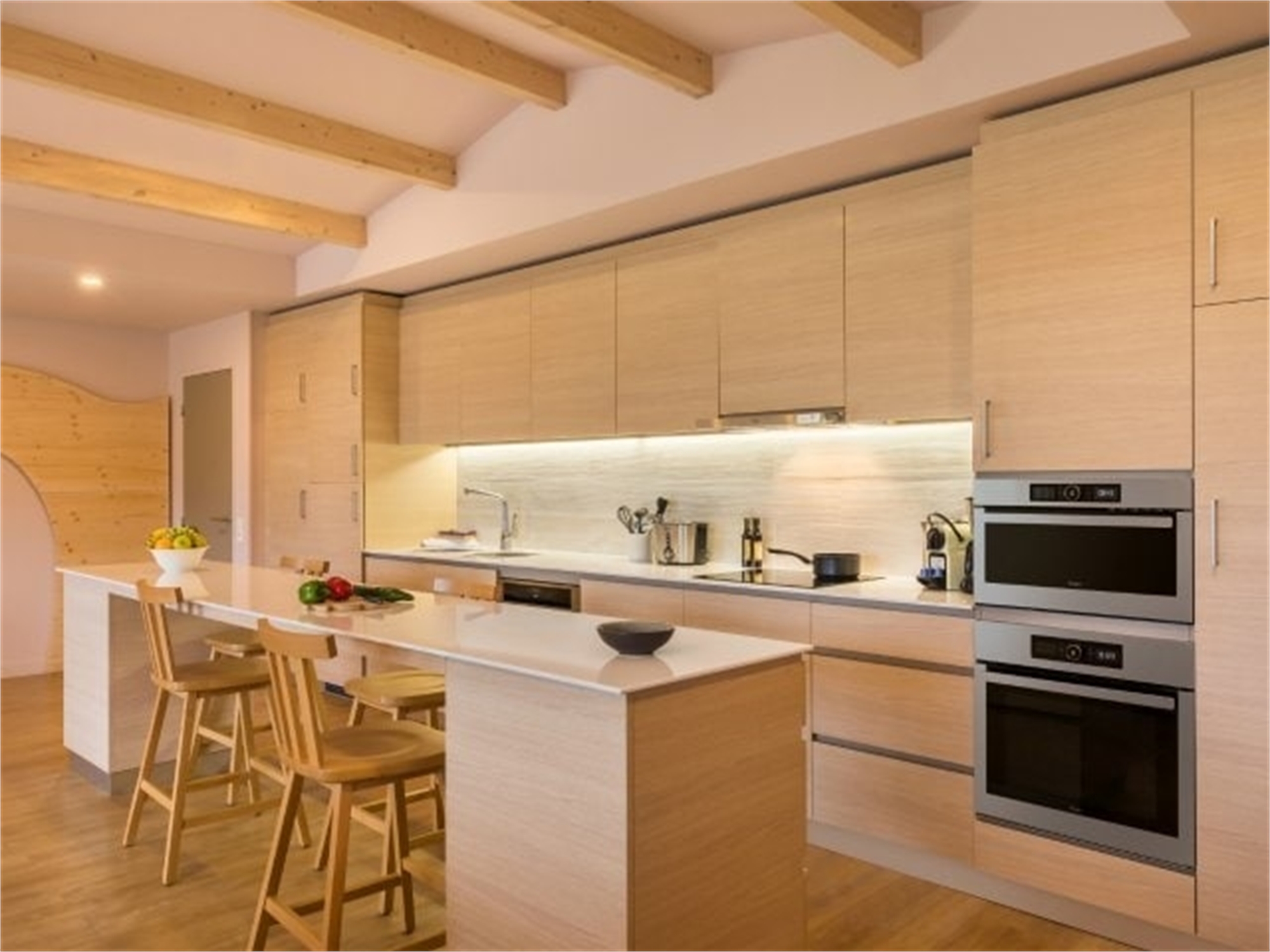 Voll ausgestattete amerikanische Küche: Geschirr, Geschirrspülmaschine, Spülset, Mikrowelle mit Grillfunktion, Induktionsherd (4 Kochstellen), Dunstabzugshaube, Kühlschrank, Filterkaffeemaschine, Nespresso-Kaffeemaschine, Wasserkocher, Toaster, Abfallbehälter für die Mülltrennung