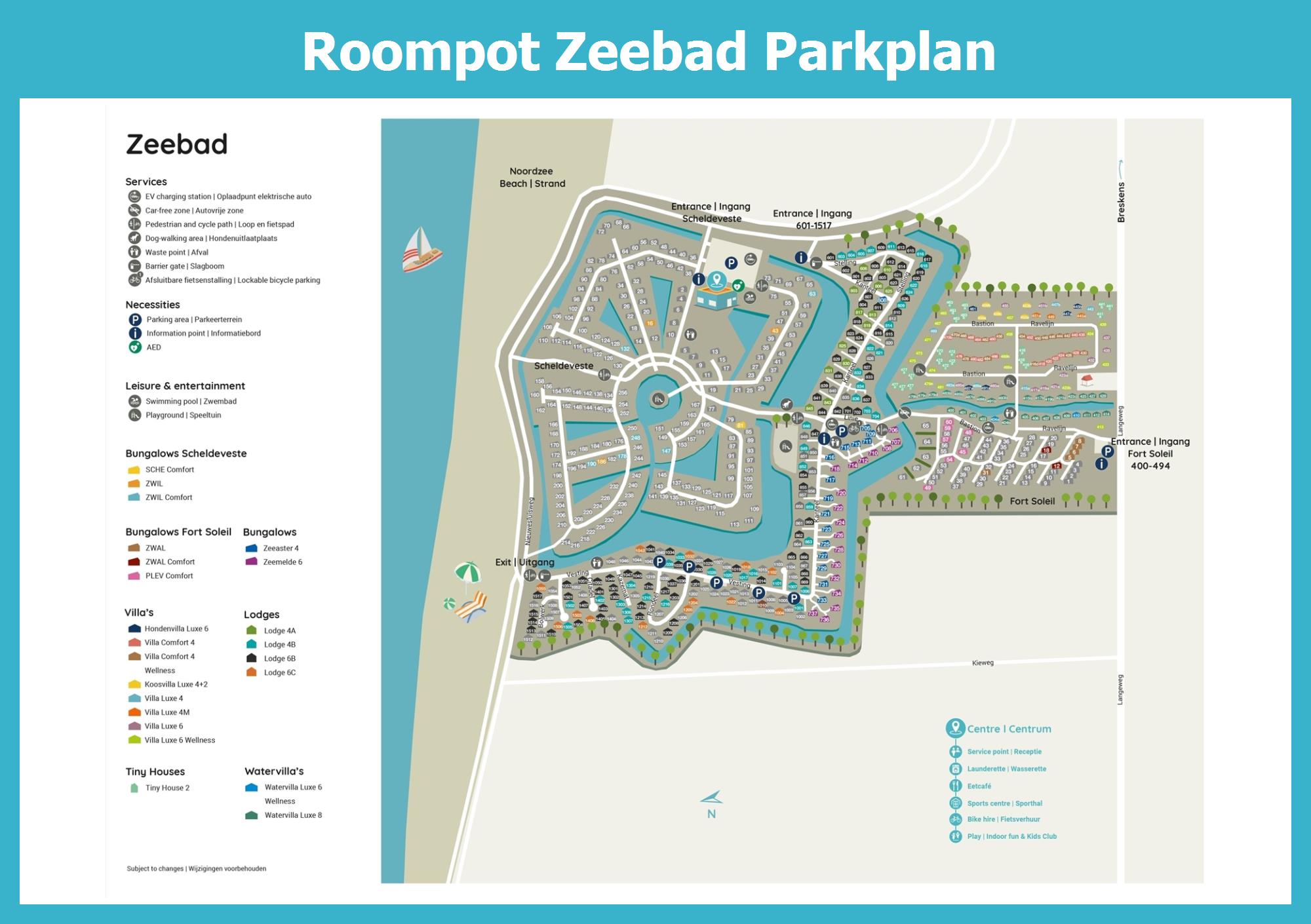 Aktueller und übersichtlicher Parkplan von Roompot Zeebad mit alle Unterkünfte und Einrichtungen, auch als PDF herunterladbar.