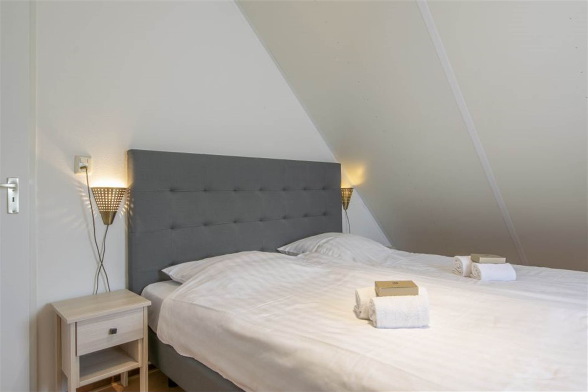 Dieser freistehende Bungalow ist für 4 Personen konzipiert. Unten findest du ein modernes Wohnzimmer mit Sitzbereich und Chromecast-Fernseher und eine offene Küche mit Essbereich. Die Küche verfügt über einen Geschirrspüler, eine Filterkaffeemaschine und eine Mikrowelle. Vom Flur aus hast Du Zugang zur Toilette und zum Badezimmer mit Dusche und Sauna. Im ersten Stock befinden sich 2 Schlafzimmer mit jeweils 2 Einzelbetten. Auch hier findest Du ein zweites Badezimmer mit Badewanne.