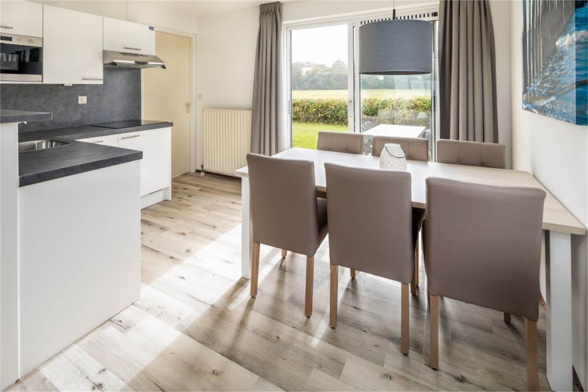Dieser restylte, freistehende Bungalow eignet sich für 6 Personen. Das Wohnzimmer verfügt über einen separaten Essbereich und die offene Küche ist u. a. mit Kombi-Mikrowelle und Geschirrspüler ausgestattet. Außerdem gibt es 4 Schlafzimmer mit je 1 oder 2 Einzel-Boxspringbetten, ein Badezimmer mit Dusche und Badewanne sowie eine separate Toilette. Im Außenbereich finden Sie eine möblierte Terrasse und die Nutzung von WiFi ist gratis.